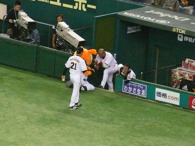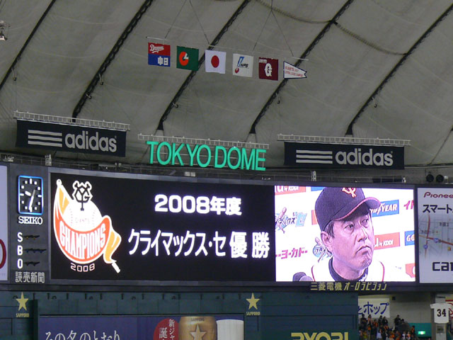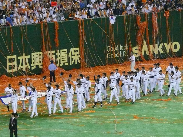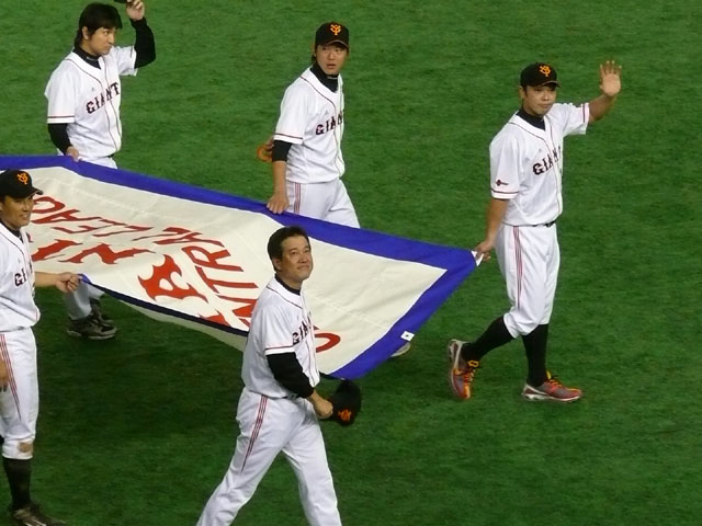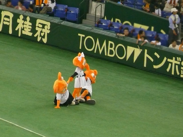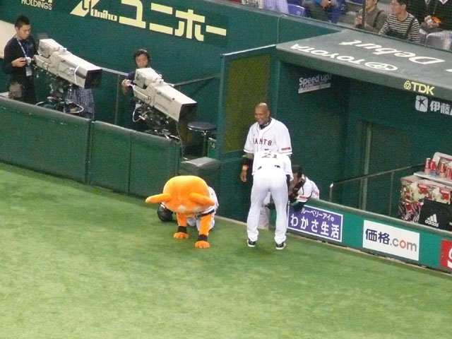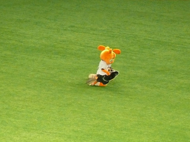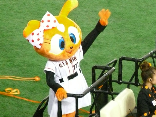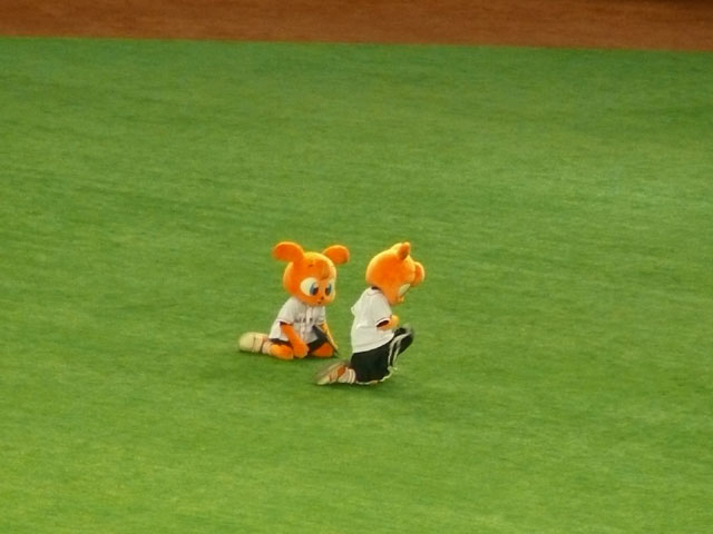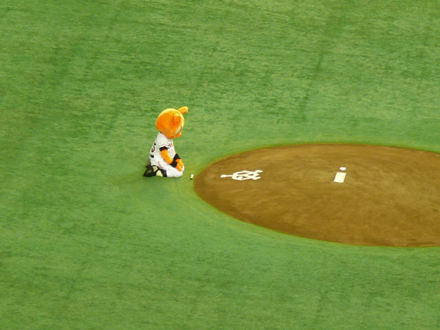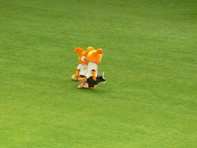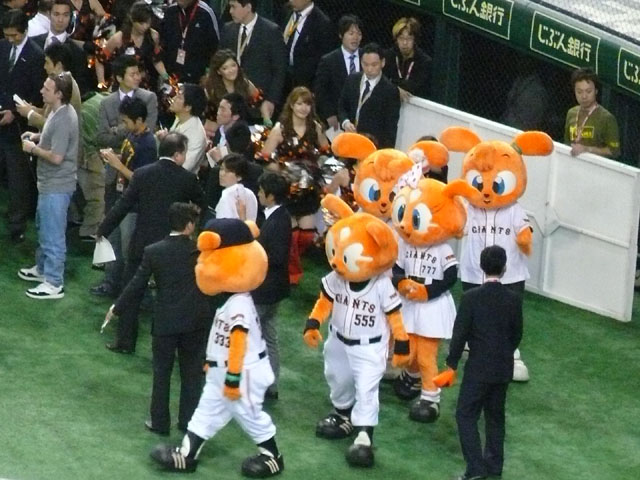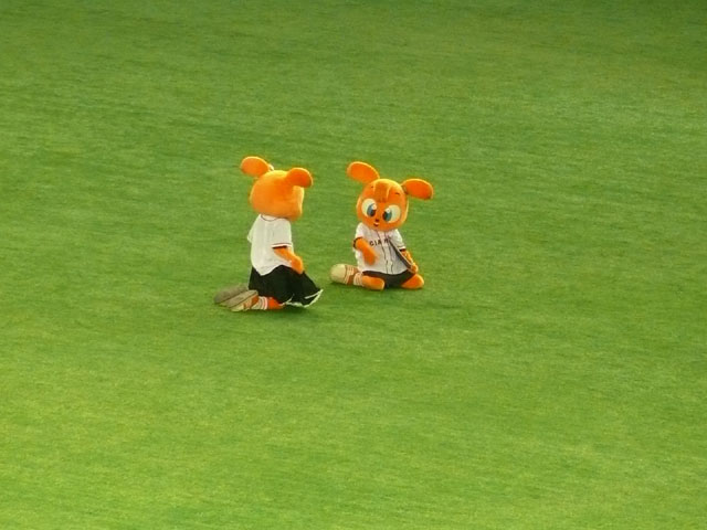 立ち膝になってる。 キッズジャビットのかわいらしさはもう・・・。 チャピースカートはためかせてるよ。 その頃1塁ベンチでは・・・。 ラミちゃん。 有名な某マスコットサイトさんでも見たことあるんですが定番なのか組体操。 これからここで戦いが始まりますよ。 ということで巨人優勝決まっちゃいました。 ジャビットファミリーもセレモニーでるよ。 胴上げの写真も撮ったんですけどね、ピンボケだったよ・・・。 WBCがんばってくださいね原監督。 来年はナゴヤに来てくださいませ。