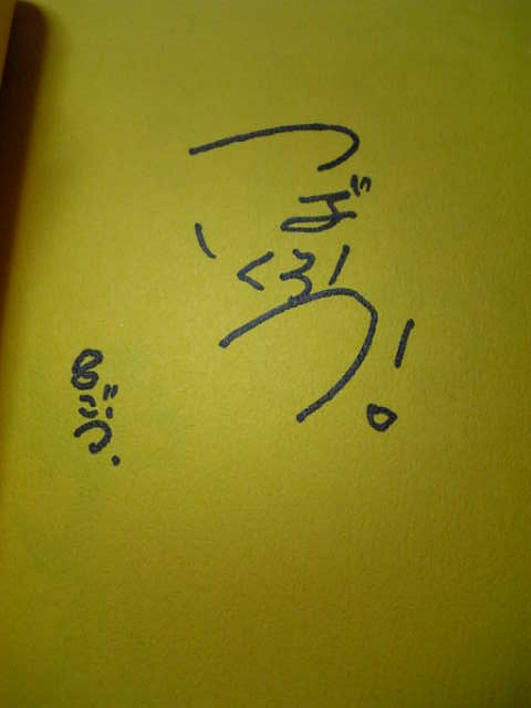 つばせんせからさいんをもらいます。 そしてつーしょっとしゃしんをとりました。 その頃の、ドアラさんと、某広報。 で、先程の売店で、千葉でお会いするお友達が、つばくろうのおなかを買ってサインをもらっているのを見て私も即、つばくろうのおなか購入。ドアラさんの本は名古屋で予約してあるからいーやー。 そしてもう一度並ぶ。 つばくろうのおなか、かったよ。 8ごうです。だれかさんが9ごうだったきがします。