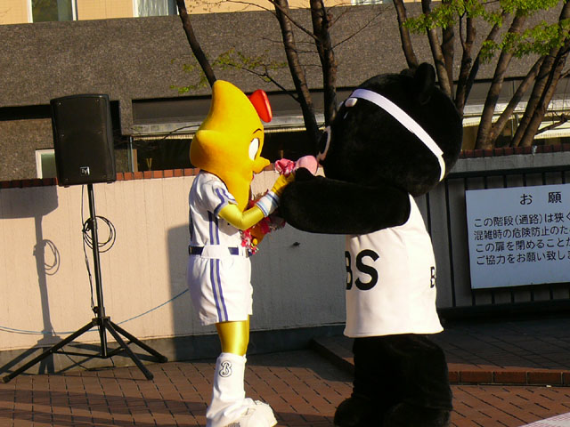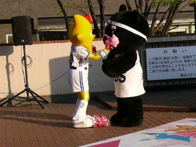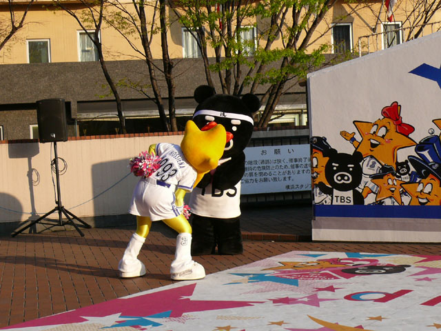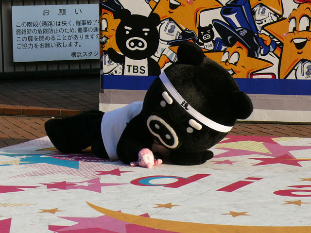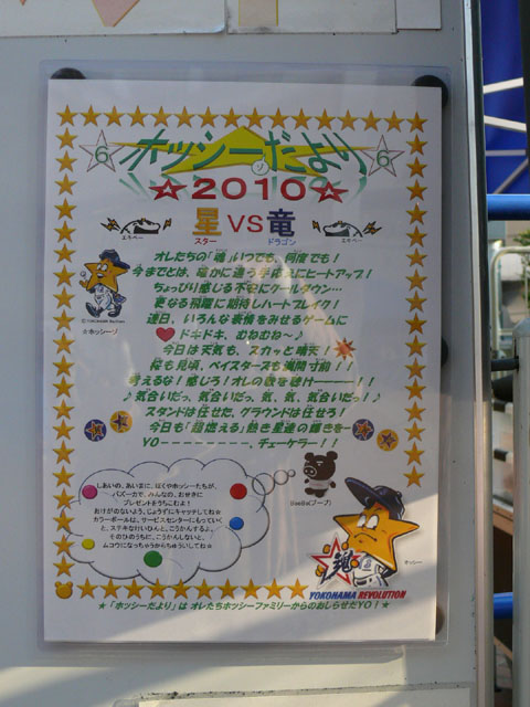 ステージは17:00から。ハマスタは再入場できるので一旦入場してドラの練習みてから外にこれる。いいことだ。 ホッシーゾだよりとブーブのお言葉。 なんでナゴドはバズーカ今年やらんのでしょうか・・・。どこの球場でもやってることなのにね。 ブーブにパソコンブログやってる?と聞かれたのでここを教えたら、知ってくれていた!マジすか。こんな一介のドラゴンズファンブログですが。 てまねき。 みてみて~。 Y.Y.パークの床にはブーブが混ざっているのね! パオロンパペットと添い寝。 ホッシーナがきました。 なになに~? パオロンパペットですよ。 手にはめちゃいます。 なげちゃいます。 っとと、ホッシーゾ。 お、ついに登場? エキベーだ! 次はステージです。