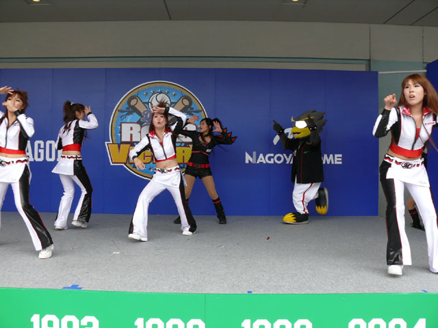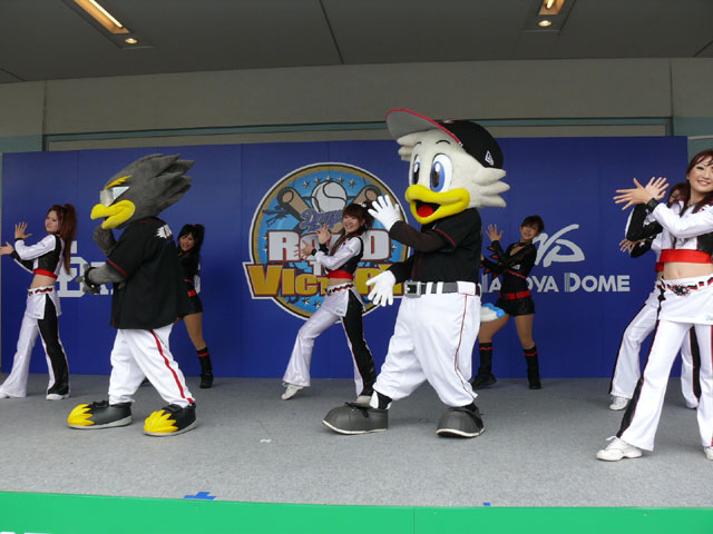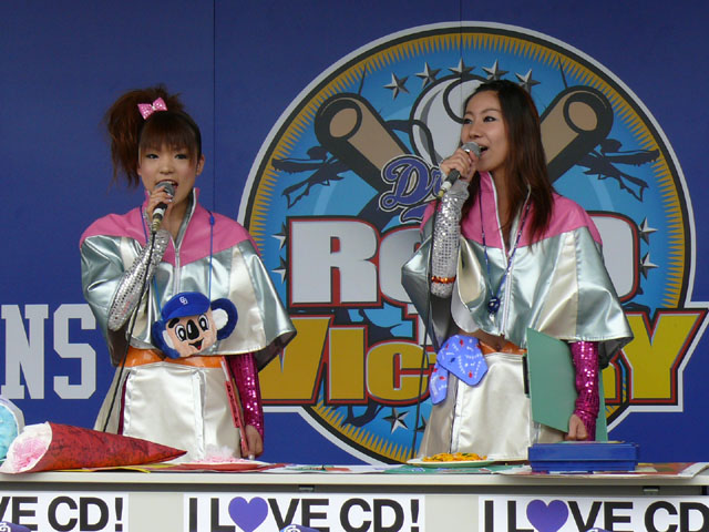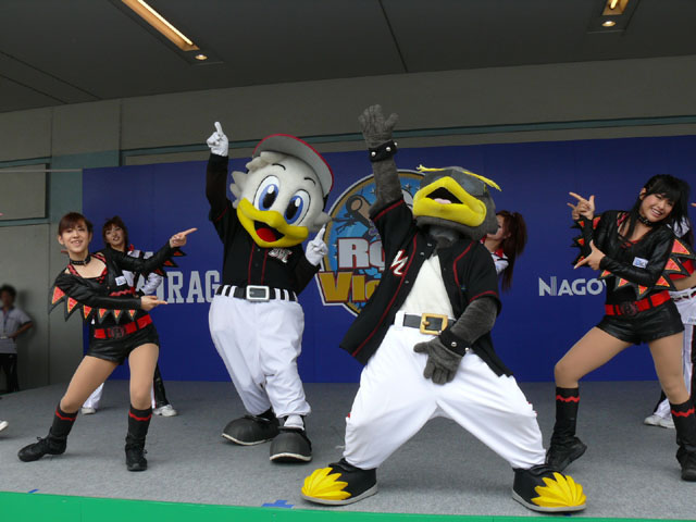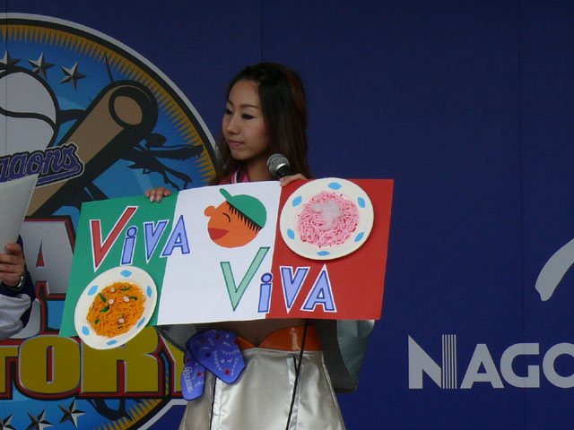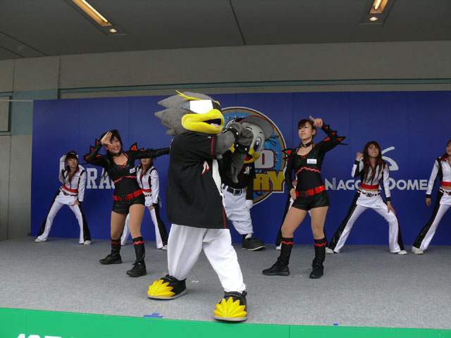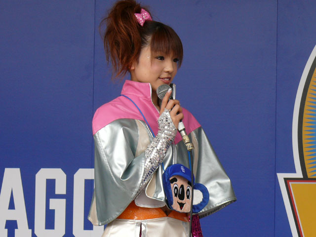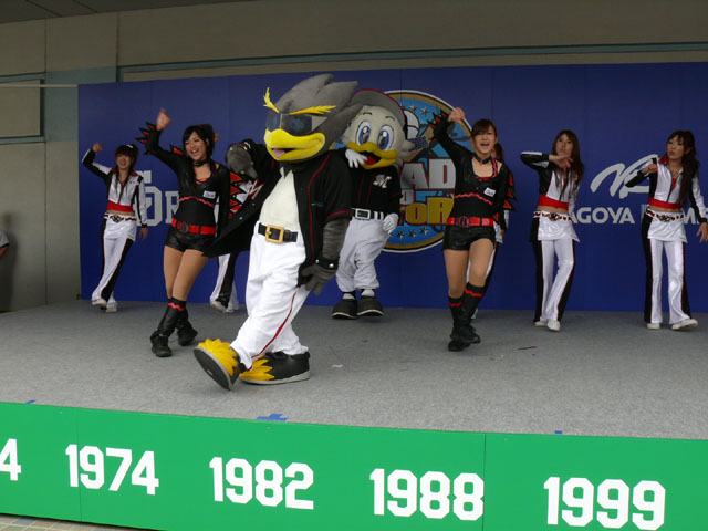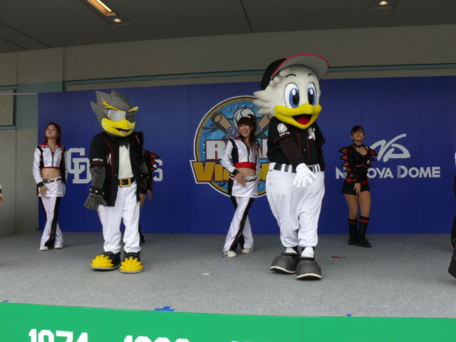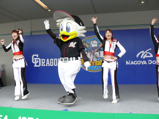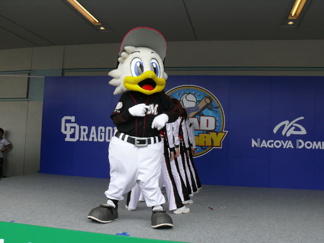 「COOL、調子に乗っちゃダメだよ」 今度はCOOLがマーくんにステージの外に追いやられますw 「マリーンズをよろしくね!」 マーくんがM☆Splash!!のみんなとかわいく踊ります。 ひっそりとしながら目立つCOOLw そしてまたCOOLも前に出てきました。 はだけてるねCOOL。 HR打ちました!? にらみあいっこ? 最後は仲良く踊ります。 楽しいステージをありがとう!2回目のD-STAGEの次はいよいよダンスバトルですよ! 一旦マリーンズのみなさんはステージからさがって。 ドラゴンズインフォメーションへ入ります。 D-STAGE周辺は人がたくさんなので動けません・・・。 いまちゃんとなおちゃん。いまちゃんのドアラフェイスポーチが非常に羨ましい・・・。 なおちゃんの腰にあるミニタオルは、去年ゆかたデーで貰いました。 明日はサラリーマンデーなので先着2500名様の働いている人にリール型ストラッププレゼントですよ。 でもドアラポーチのほうがいいなぁ。販売してくださいませ。是非。 ドームのお店はVIVA VIVAさんをご紹介。ピンクのパスタはマウンテン調(ぉぃ なおちゃんのMCはかなりいいけど、いまちゃんはしゃべるときにカンペボードをもうちょっと下げたほうがいいなぁ・・・。 ボードで顔が見えないのは勿体ないよ~。 次は選手とハイポーズの更新ですね。 小笠原投手、6回はちょい勿体なかったけれど、またまた次に続く好投見せてくれました。 このまま1年間ローテ入り守って!