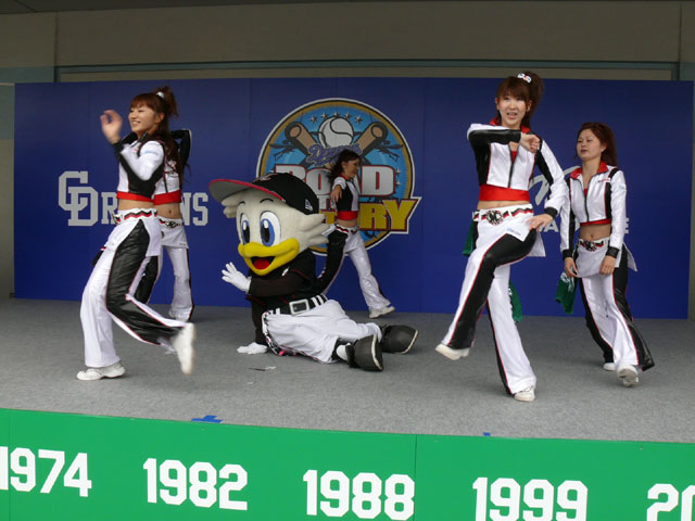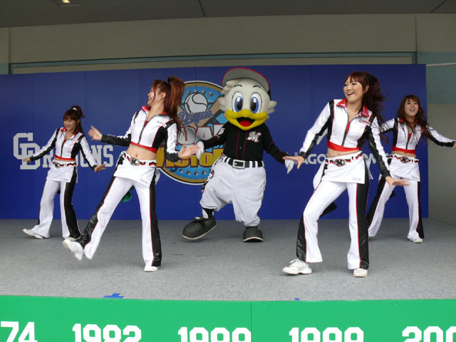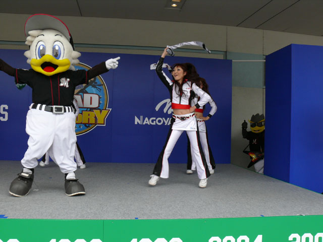 1回目のD-STAGEのHAPPY SHOW TIME(ブルーマックスメインの通常のショー)終了後に、マーくん、COOL、Mスプのショーが始まりました。 ちなみにダンスバトルは2回目のショーの後でした。 司会進行のお方。インパクトありまくり。 何か見えてます。 マーくん、1年ぶりの登場! Mスプのおねーさんたちもようこそです! まず最初にドラゴンボール(悟空が少年の頃の)が流れてビックリ。Mスプはこういう曲で踊るんだ~。 掴もうぜ♪ドラゴンボール♪ かめはめ波! 続いていばちんでおなじみアゲ♂アゲ♂EVERY騎士。 マーくんその座り方は・・・? D-STAGEで見るとシャオロンデー思い出しちゃう。 息ピッタリの踊りです! 続いては~!タオル出して~! マリーンズファンの人たちは速攻タオル出してました。びっくり。 千葉ロッテマリーンズの応援といえばタオルとジャンプですからね。マーくんが踊れないはずがありません! しかしそんなカワイイマーくんを影から・・・! というわけで続きはまた後日。 おまけ。 試合終了後にCOOLのところへ行って、「サングラスとってー!」とリクエストしてみた。 快くはずしてくれた! あぁ、一度見たかったのだよ・・・ありがとうCOOL!