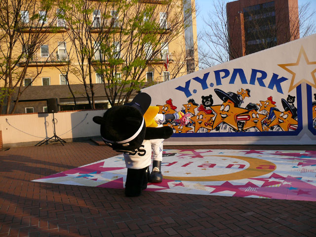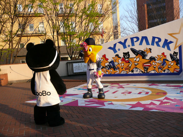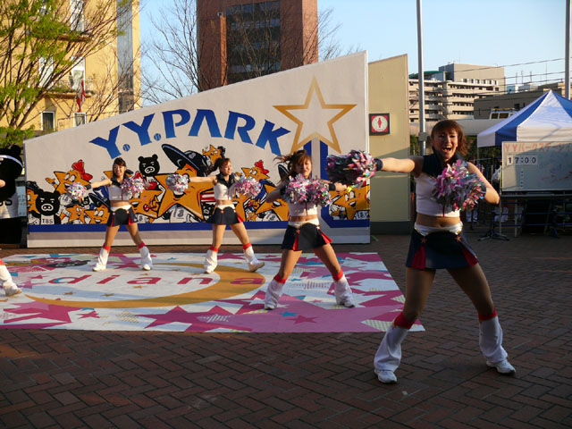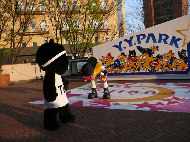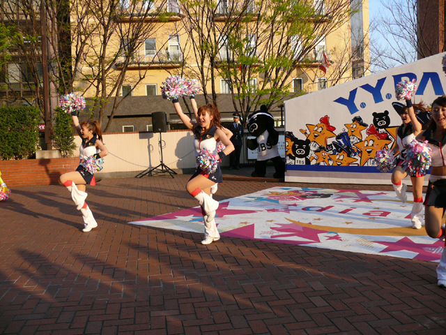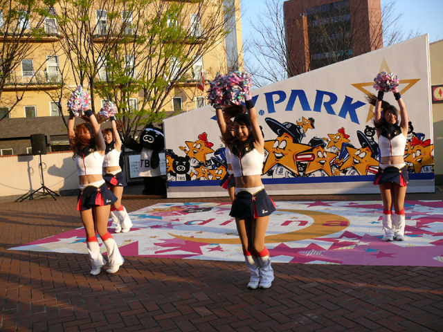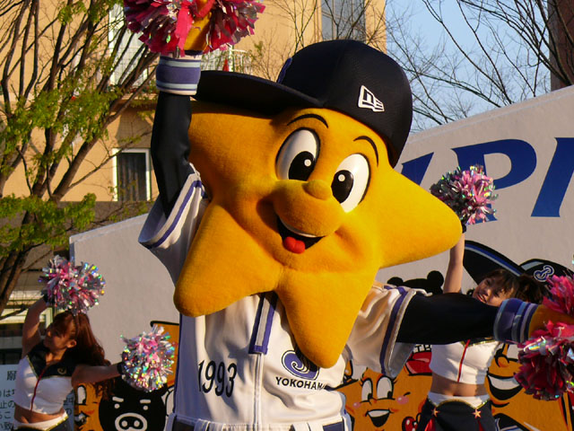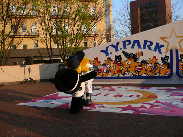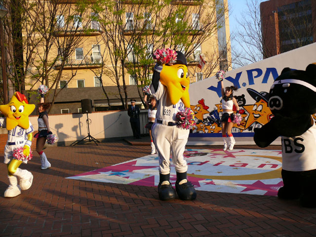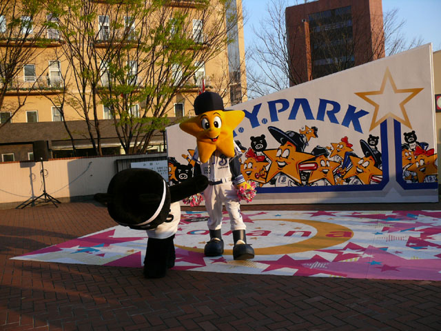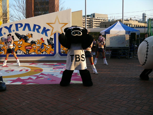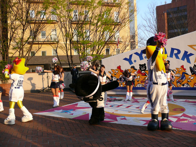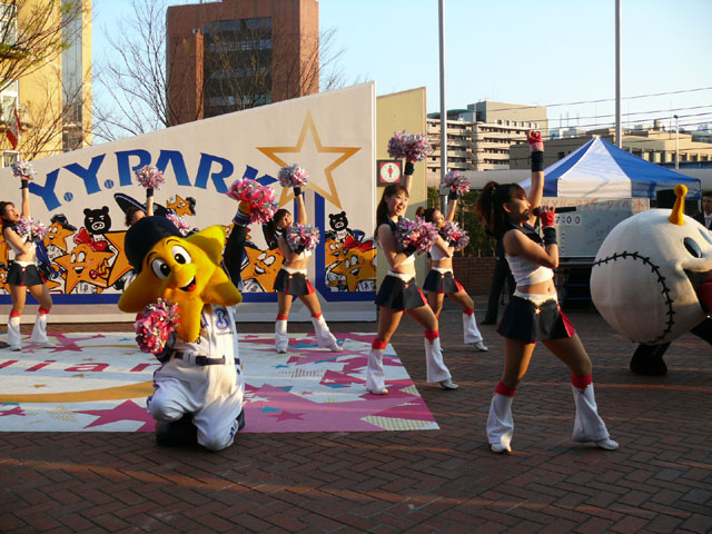 おお、ラインダンスやるのね! マスコットたち再登場。 顔ですか顔。 お~お~おお~おおおお、よ~こはまベイスタ~ズ こんな感じの15分のステージでした。 そりゃあたるがな。 かわええなぁ。 やっとエキベーを目の前でみれたよ。 次はグラウンド内ね。