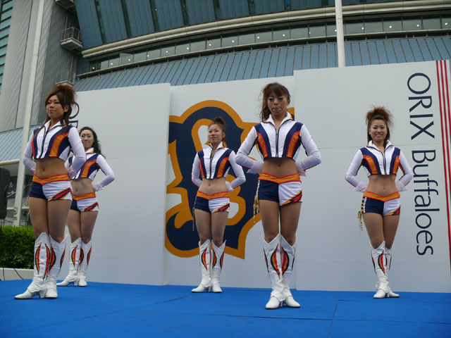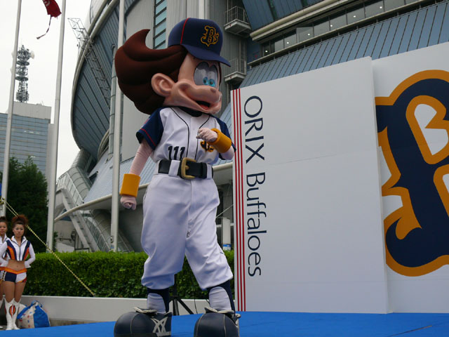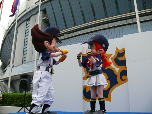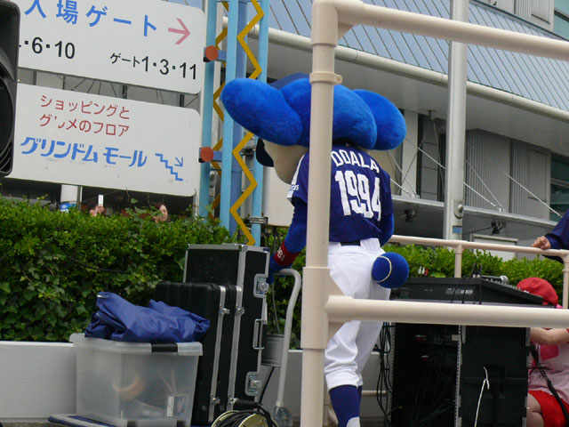 そしてステージ前。平日なんですがドアラ効果で凄い人。 出番待ちのBSドリームズのみなさん。 ネッピーとリプシー登場です。 ネッピー。 リプシー。かわいいです。 そしてBSドリームズの登場です。 BSドリームズのダンス動画撮影してみました。 ネッピーとリプシーもダンスが得意だそうです。 青いのが・・・。