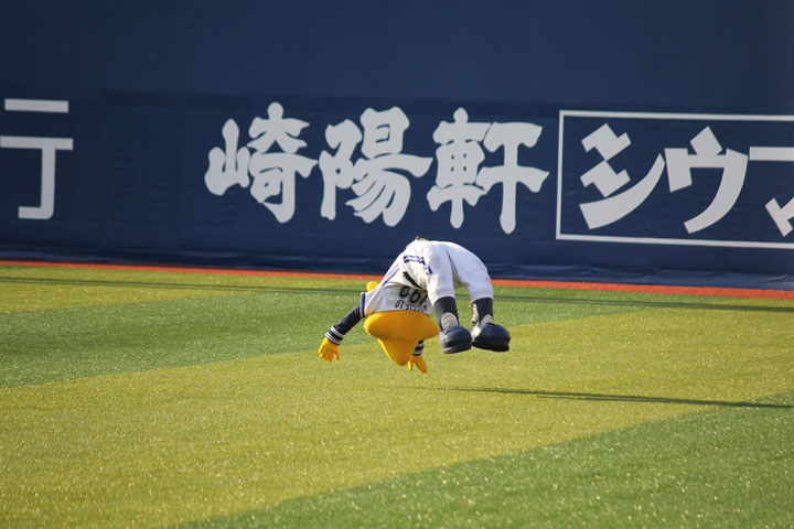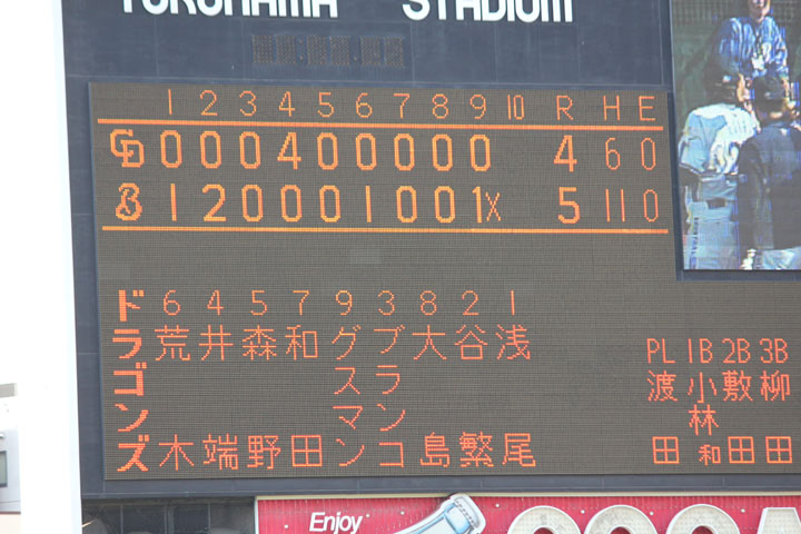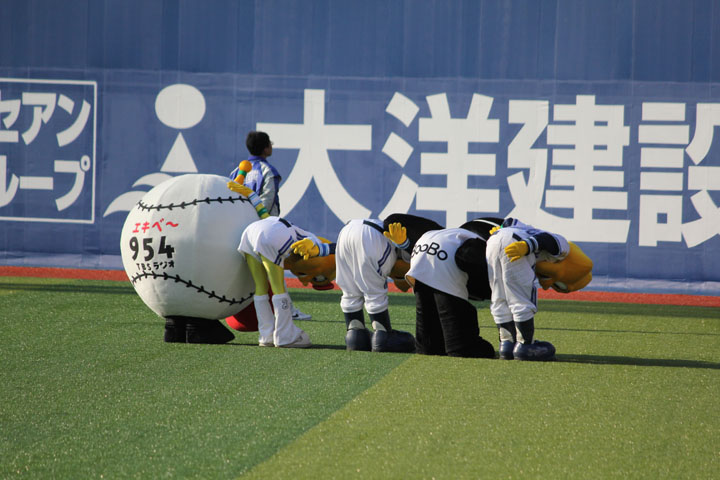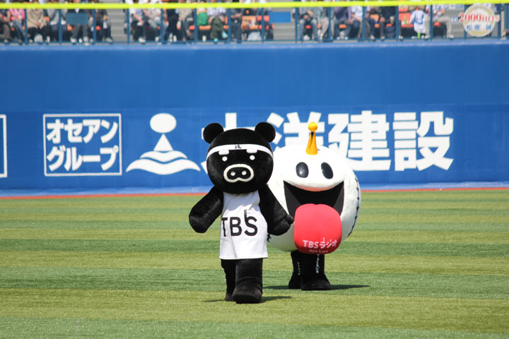がんばろう日本。まだスタンツはなしね。 黒と白が忍び寄る。 ゾさんも3塁側へ。 ロックオン。ブーブさん目がいいです。 連続バク転するために来たのね。 みたよね? 始球式は萩原欽一さん。一通りのお約束マイクパフォーマンスもありました。 5回裏は3塁側も来ますよ。スタンドにはさすがに来ません。 ダンスコンテストは自分が優勝!? で、いきなりサヨナラ負けしてしまいました。 もちろん、ベイスターズが勝てばホッシーは嬉しいわな。 勝って跳びます。 みんなそろってライスタにご挨拶。 ドラが負けたのは悔しいんだが、癒してもらえる。 ハマスタはネットなくて簡単にハイタッチできていいなぁ。やっぱりいい球場だと思いますわ。
