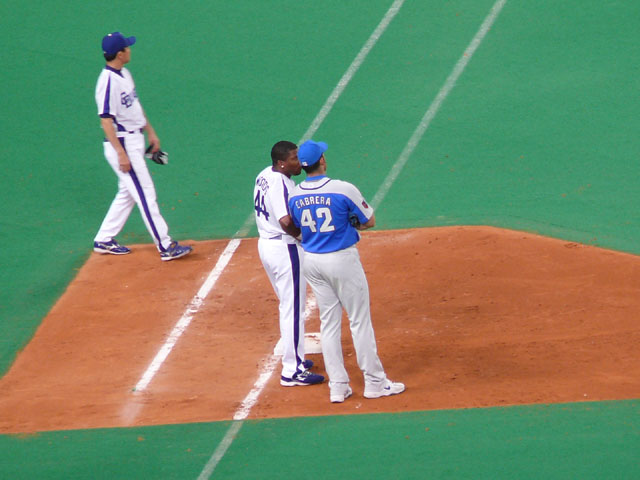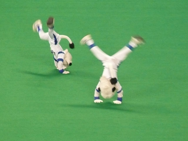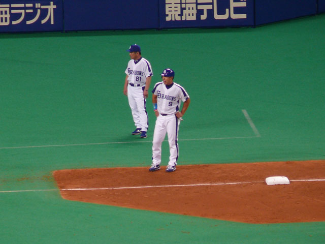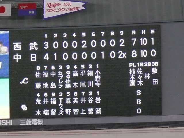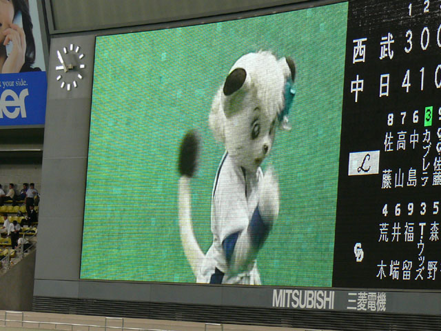 最終スコア。岩瀬様が・・・(´Д⊂ヽ この日はパノラマ最前列でゆかりんと観ていたけれど、9回には2人して呆然としていました。私は電車の時間も気が気じゃなくて、延長入ったら帰らなきゃいけませんでした。 9回で終わってよかった・・・。 マサさん・・1回表だけで40分かかったですよorz たしか今季初ナゴドだったよね?かいちょ。違ってたらごめんなさい。 声援に答えるリアルドアラもりのん。 何故かこのシーンよく見ます。 なかよしこよし。 元気ハツラツ。 チアドラなおちゃんとの衝突事故で前科持ちになってしまったシャオロン・・バイクはしばらく乗れないそうです。 レオとライナちゃんはレフト前で。 5・4・3・2・1・ファイヤー! あ、落ちちゃった。 おお、ライナちゃん凄い! 兄妹仲良く帰ります。 マサさん残念ながら交代、2番手すーさん。 5回裏終了。みんなドアラを見ています。 レオ、5回裏にもバズーカー? パオロンはやっぱりカワイイなぁ。 私がTake Me Out to the Ball Gameが好きなのはパオロンのダンスと、最後にドアラのバク転があるからです。 もちろん曲も好き。 「決まったぜ~」 7回の表ライオンズのラッキーセブンの前にやってきました兄妹。 うん、美女(美ライオン?)。 揃ってバク転! コースケさんが綺麗な見とれるHR放ちました!思いっきりドアラにハイタッチして・・ドアラコケましたw それでもドアラも嬉しいからバク転! 9回裏、何かが起きる気配・・・。 間違いなくヒーローね英智さん! はっ・・・(;・∀・) 本当に重要なところになると打ってくれるよね。 アナタナニシテンデスカ。 噂の罰ゲーム・・・。 「勝つまでオレたちが体を張るよ」 ライオンズカードとピコピコハンマー・・・あのハンマーがドアラメガホンだったら凄いのに。 して、そのカードの中身は・・・。 「レオ&ライナ、夕ごはんは、みそかつ定食カツ抜き」 赤味噌だけでもおいしいよ(論点違・・・ ナゴドに矢場とん入ってくれないかな(更に違・・・ 次には飛ばした7回裏終了後のレオとドアラのバク転動画載せます。