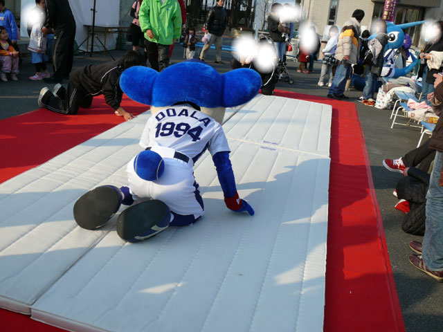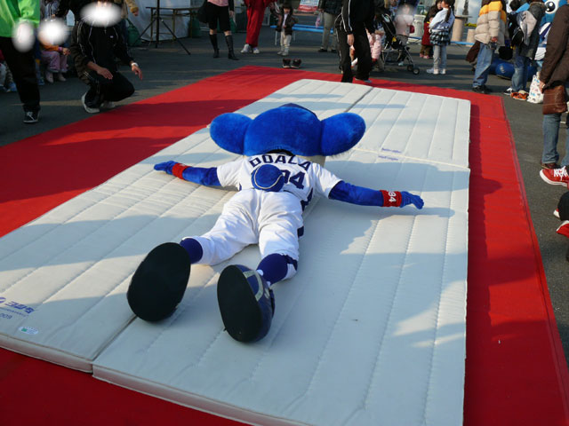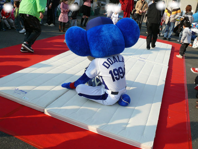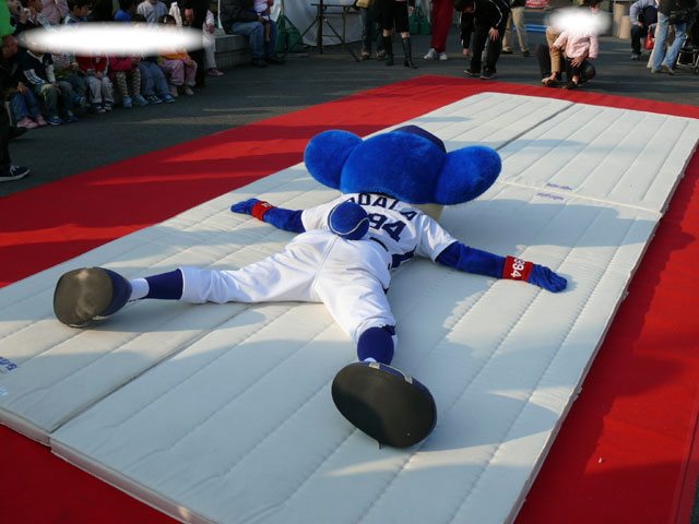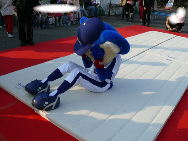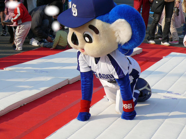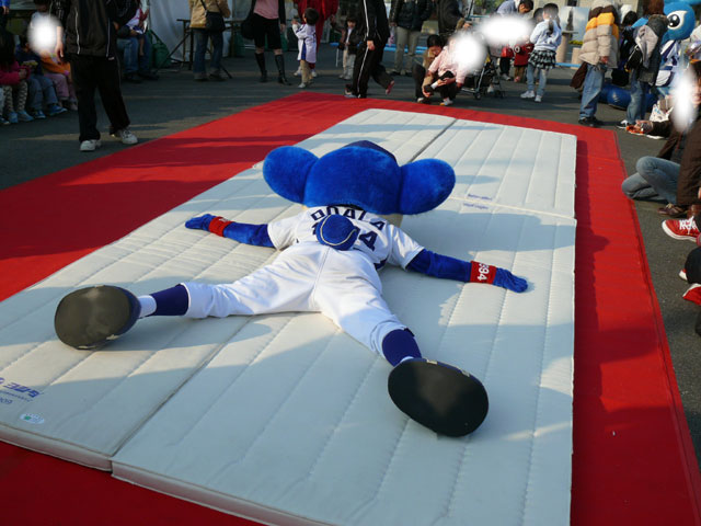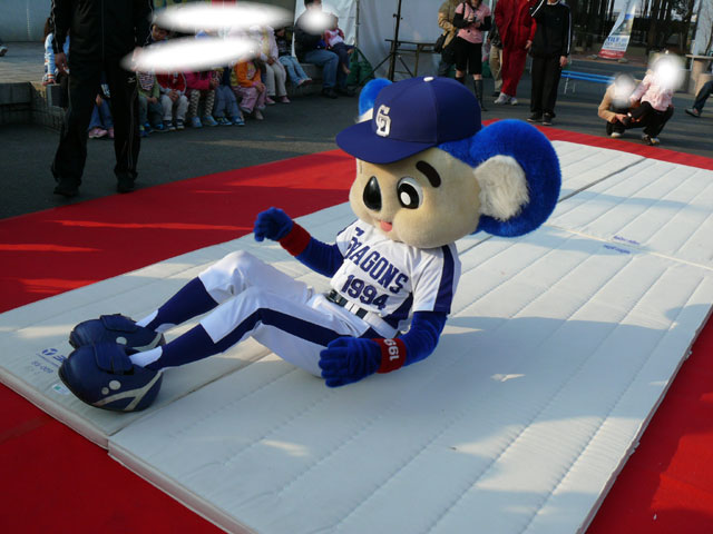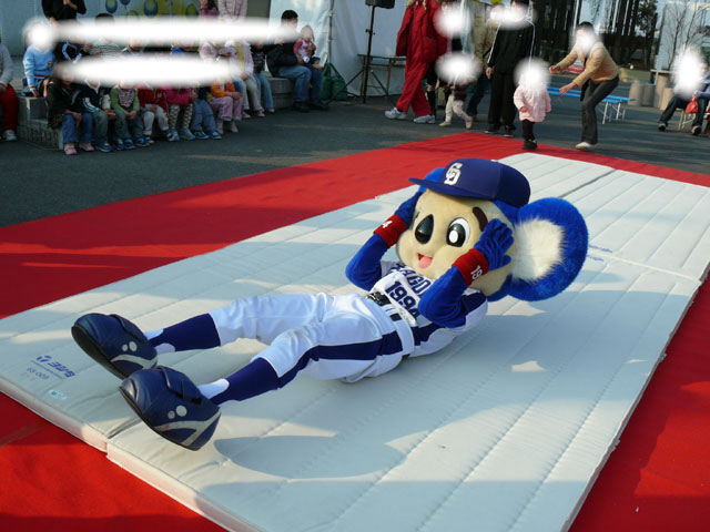体操のおにーさんが一斉にバク転しました。すげー! その体操のおにーさんの「バク転できる人~?」という呼びかけに。 意気揚々と手を挙げるシャオロン! 私:「シャオロン、バク転できるの!?」 シャオロン、うんうん、とうなずく。 すげぇ!そりゃナゴドでやればドアラ抜いて大人気になるじゃないか~!! しかし何故かシャオロンのバク転姿は見られず。。。 ドアラも体操教室をサポート。この女の子とよく一緒にいましたが、ドアラの好み? 体操教室の最中、しばらくシャオロンに遊んでもらう。 シャオロンが混みだしたら、反対側へいってパオロンと遊んでもらう。 私はひたすらシャオロンとパオロンの往復をしていた・・・。写真撮ってもらったり、サイン書いてもらったり。 ドアラ、ハイハイの図。 ドアラのために分かれていたマットが合体されました。 だがしかし。 そういうことを。 するためでは。 ないのかと。 いやいや。 腹筋も。 違うだろと。 ごめんなさい、力尽きた。画像加工手抜きしてるのに大変だ・・・orz 次が最終レポで。