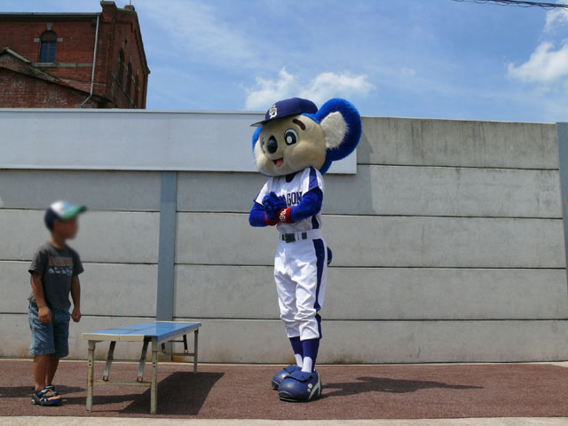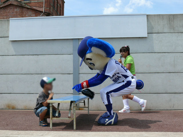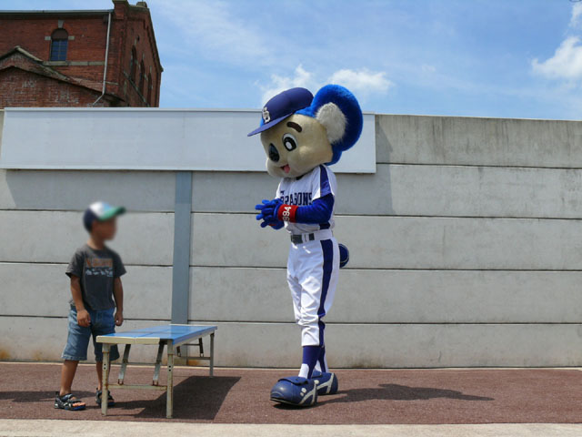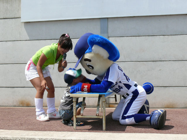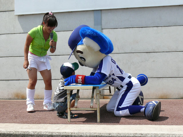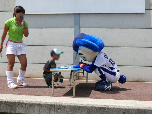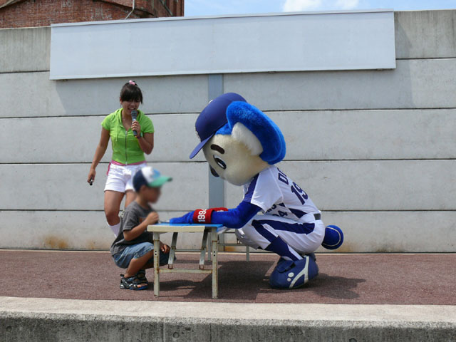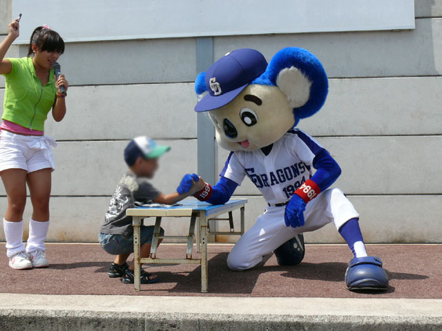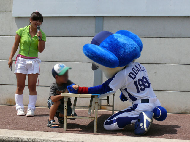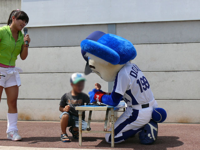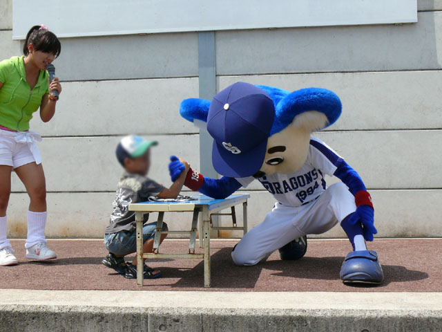 「そこのキミ、かかってらっしゃい!」 やたら気合タップリです。 と、ちょっと待って・・・。 テントからミニタオル持ってきます。暑いし痛くなりそうだしね。さりげないやさしさがニクイ。 「さぁどうぞ」 Ready Go ドアラ、2秒で少年を瞬殺・・・。 少年が痛がっていて、ドアラ慌てて慰めます。 じゃあ反対の手で再戦。 今度は少年の勝利! ドアラ優しいなぁ。お子さんには優しいドアラ。 そしてポストカードへサインを入れてプレゼントです。 今度は大人との対決に続きます。