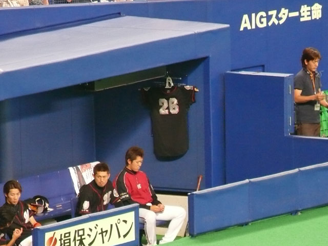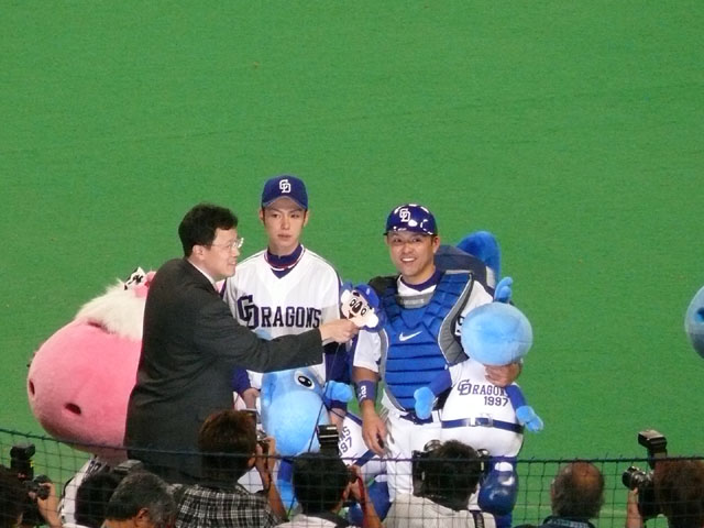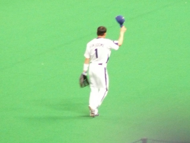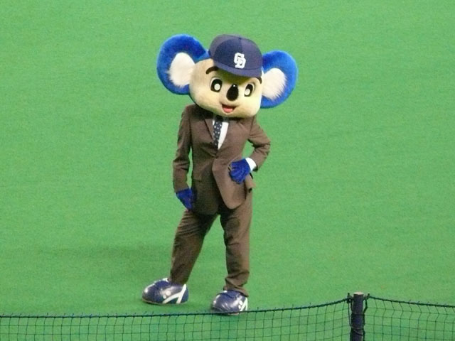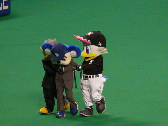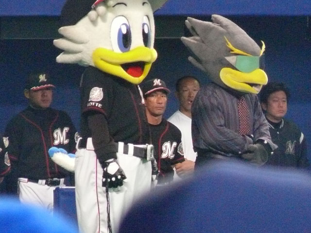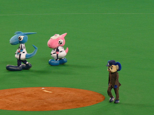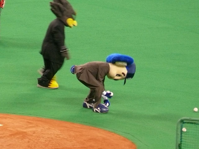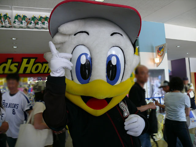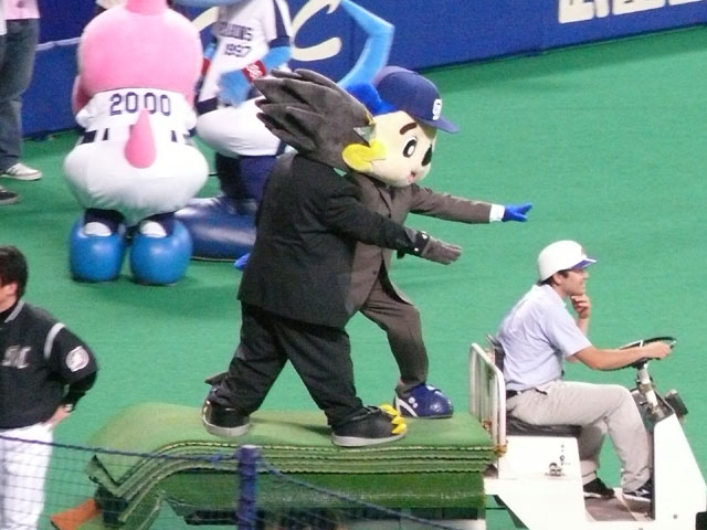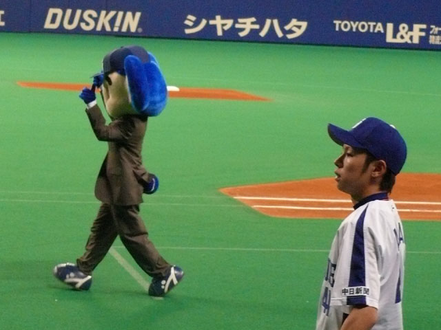 マスコットを撮影して選手を撮り損ねている、そんなあなたが・・・好き(ノリカ風に) コースケさん、走るの早いですから。TV画像でも追いつきませんでしたよ。 昼頃まで行くか行かないか迷ったんですが(はあ〜) ドアラのスーツ姿は・・・。サラリーマンに向いてないんでしょう、きっと。 ちなみに私も今年のメイツさんのユニ、好きです。 すっごく着てみたい(ああ、男子からブーイングが来る)