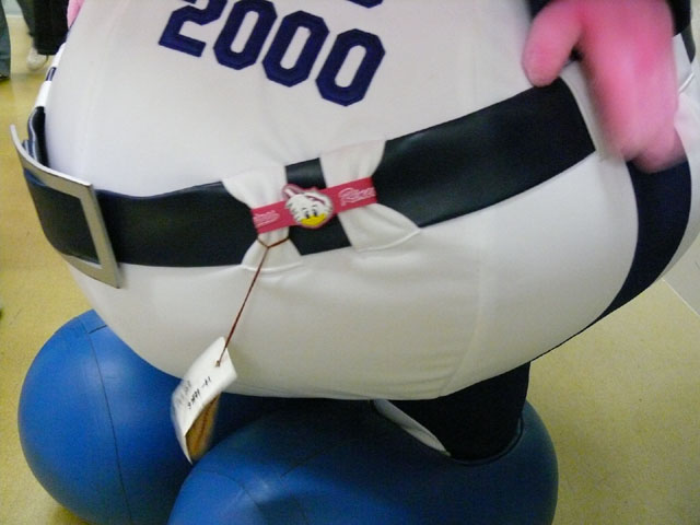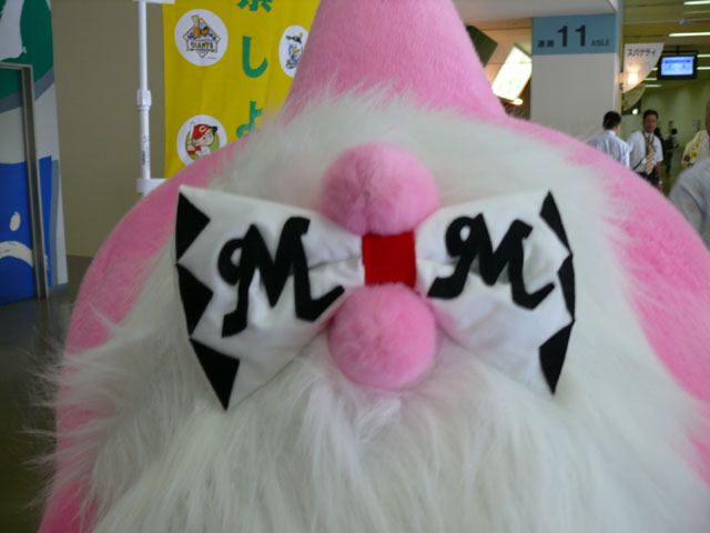 日曜日、ステージを前半だけにしてグリーティングの方に行きました。とは言え1ゲートだいぶ後方で入ったのですでにマスコットの前には長蛇の列…(T_T) でもEV前でドアラをキャッチ!ポーチをかかげて「どうだい!」ポーズを激写することができました。撮り終えたらドアラが「バッチリ撮れた?」と(ジェスチャーにて)聞いてきたので「バッチリよ!」ってブイサインしときました。これだけのやり取りだけど嬉しかった~~(喜) 月曜は行けなかったのでサラリーマンドアラの写真のup、ありがとうございます!千葉とはネクタイが違ってますねー。