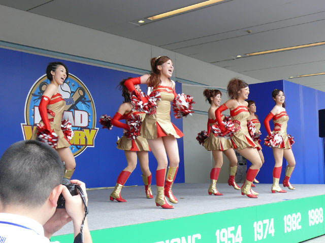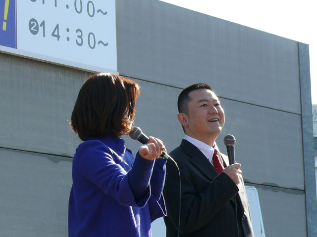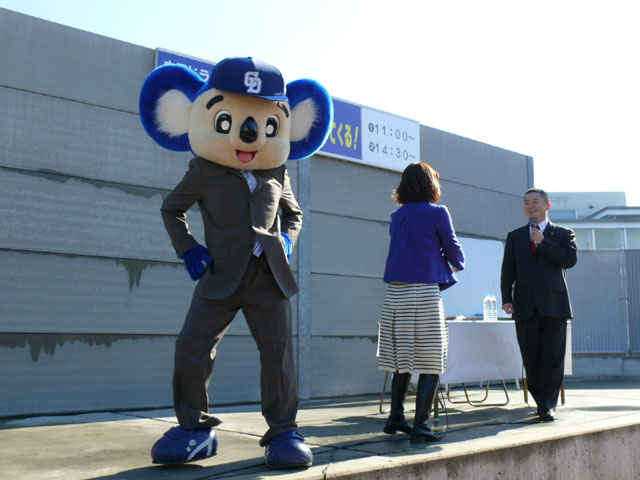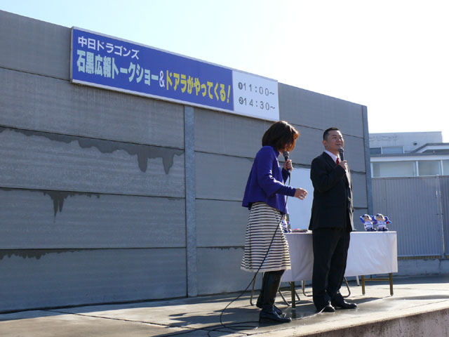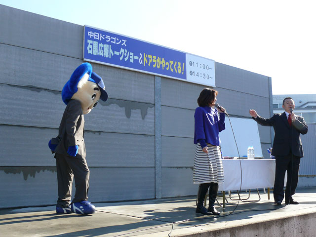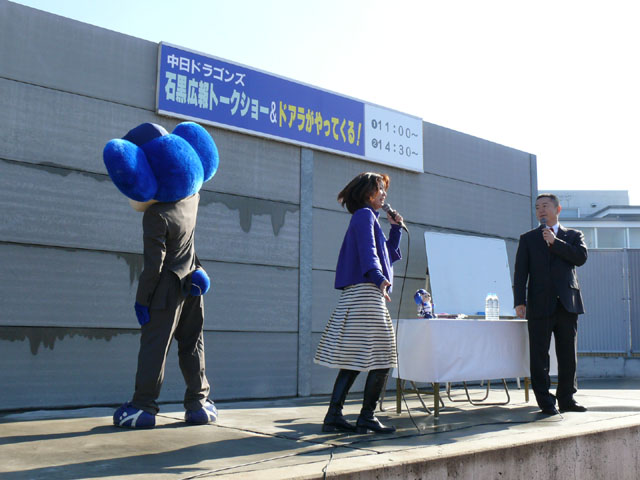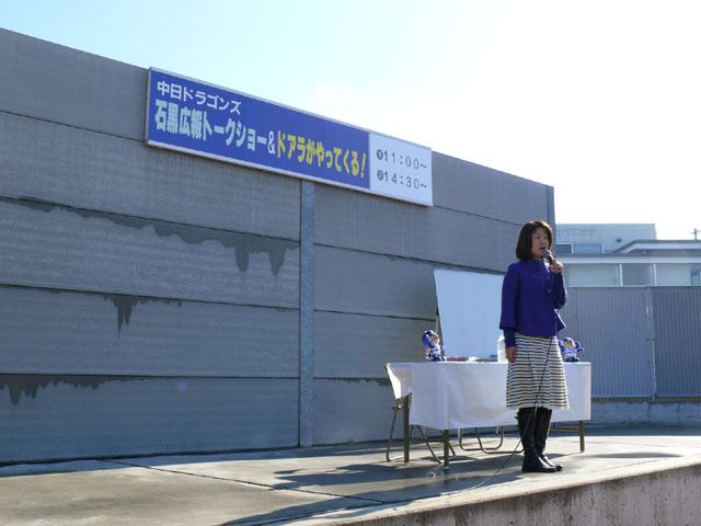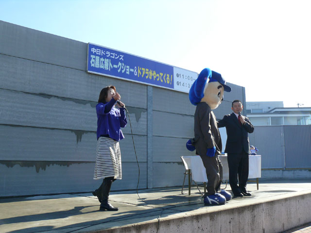 ナゴヤハウジングセンター日進梅森会場のサイトみると開場時間が10:00~。10時にならないと入れないのかなと思ったら。 駐車場に結構車止まってる。ええ?ええ??? 入れました。 しかも既にお客さん多いし。 ステージが凍っててスタッフさんが懸命に氷割りしていました。 朝からお疲れさまです。 ドアラぬいぐるみも設置完了。こっちじゃなくてよかったとちょっと思ったり(こら 10:10頃。既に椅子はいっぱいで立ち見が・・・。 しかもいろんな人がいろんなカメラ構えてます。 というわけで私は動画撮影放棄。<いつも撮ってないくせに 11:00。風もなく空は快晴で暖かい中始まります。 んで、石黒さんなんですが。今までこのブログでは・・・ 後頭部だけ載せたことありますが(だって入るんだもん ごめんなさい石黒さん、載せないことにはレポにならないので載せます。 スーツ姿に違和感を感じてしまいました。<つくづく失礼 ! もてスリム! 違和感とかそういう問題ではない。 ・・・今年もよろしくお願いします。 多分ここで写真見るよりYouTubeとかで動画観てもらったほうが早いです。