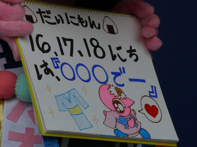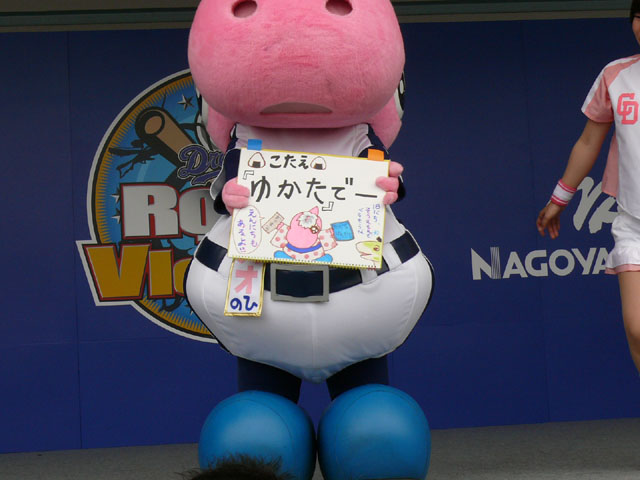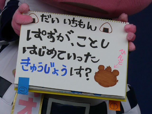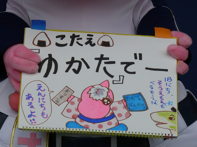 クイズの問題は次のページへ。後ろ向いてページをめくります。 じゃん! 拡大。ヒント見れば一目瞭然ですね。 答えのシーンを動画でどうぞ。 飛行機はおっきいおさかなさん。 角度悪いけどこれしか撮れなかった・・・。 続いて第2問。 拡大。これも簡単ですね。 答えは、「ゆかたでー」でした。 パオさんもそうえもん殿がお気に入りの模様。 これでクイズは終わりで、次はゲームをしまーす。ルミおねーさんがスケッチブックを預かって、次やることを見せてくれます。 続きはまた後日。