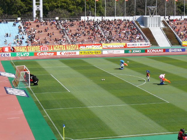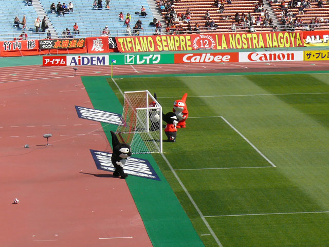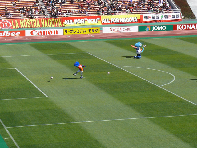 最初はJr.だけゴール前にいました。 一家集結。 ちょっと??グランパスくん??? 全くどく気がありませんグランパスファミリーw ドアラも入念に・・・。 DJさんに「グランパスくんどいてください」と言われてもしらーんふり。というわけでこのまま始めることに。 さぁ、行きますよ・・・ っと、その前にボール位置移動しなきゃ。 「おいおい、ドアラ~!」 さて、今度こそ本番ですよ・・・。 いったー!! ボールはゴールの左のほうへそれていきました・・・。 あぁ失敗・・・。 さぁ次はグランパスJr.の出番ですよ。 まだ続きます。