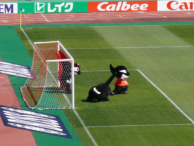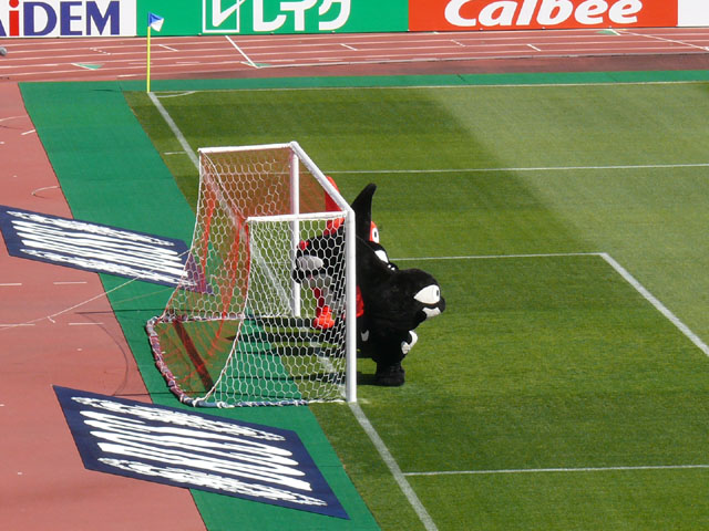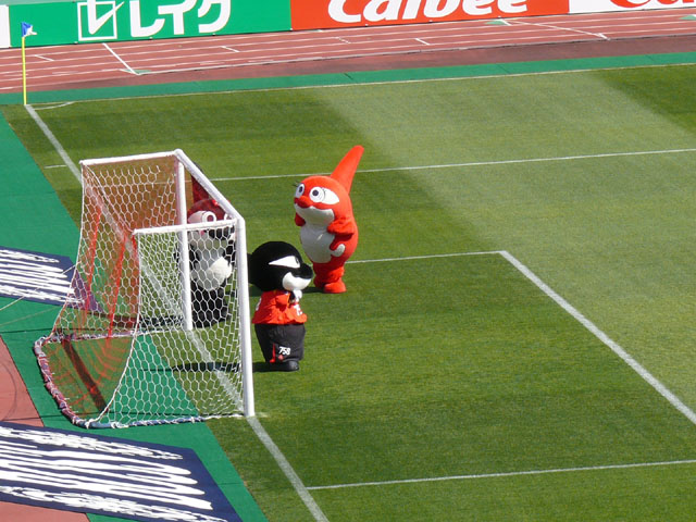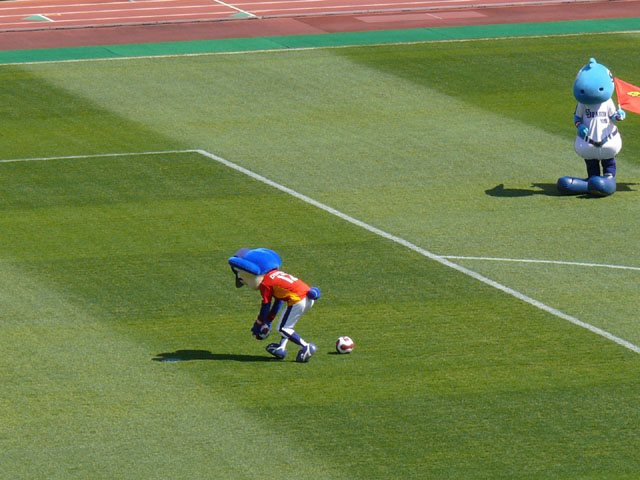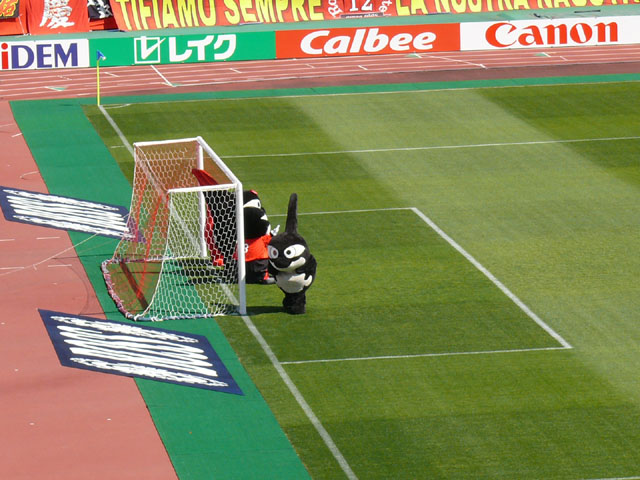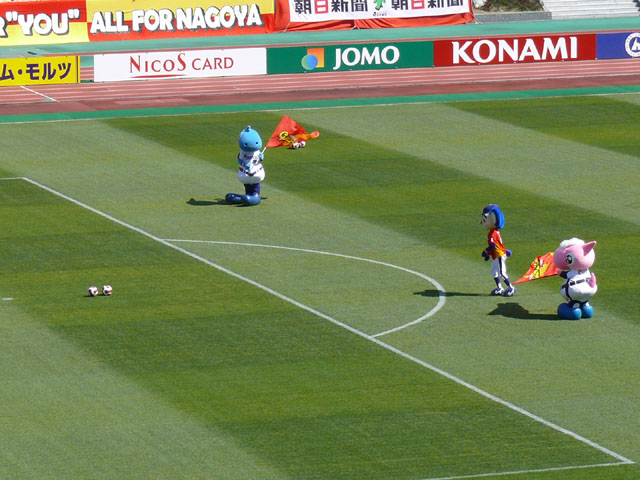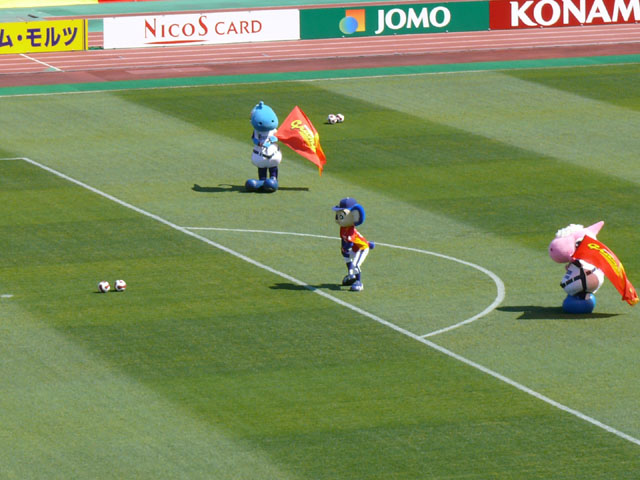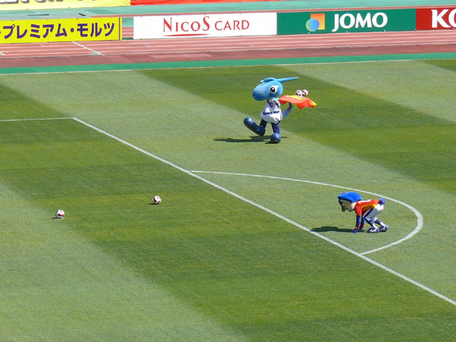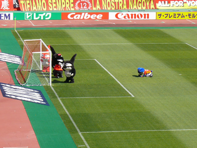 グランパスファミリーずるいですよ。。 蹴る前にぼけるのもドアラお約束ですね♪ ああ、失敗だったのね、へこんでるね、ドアラ(笑)←なぜ笑う? 後ろで一生懸命旗持ってるシャオ、パオがかわいい(^^)