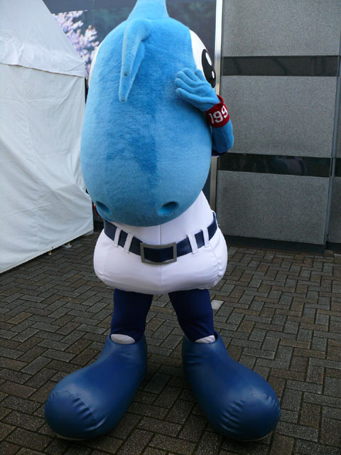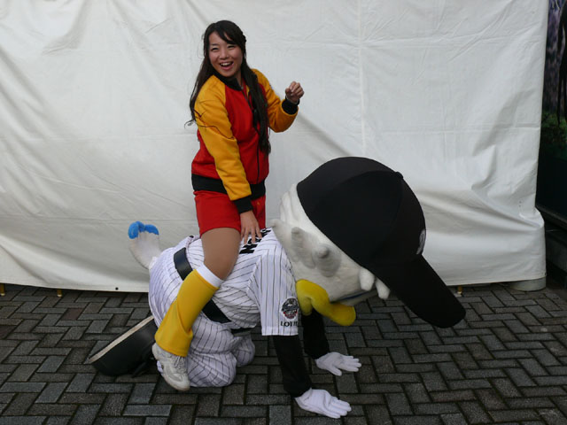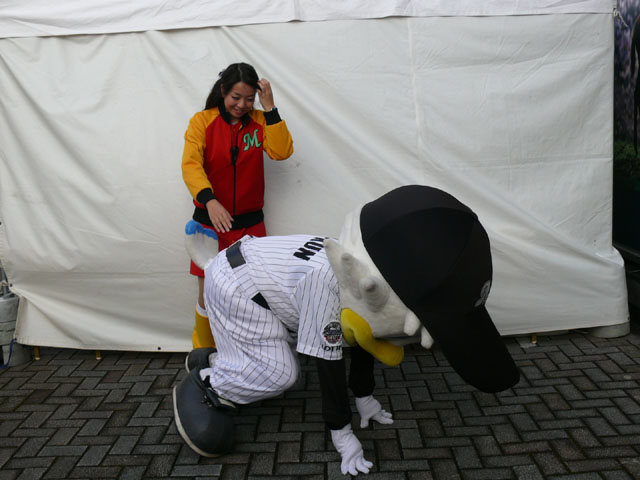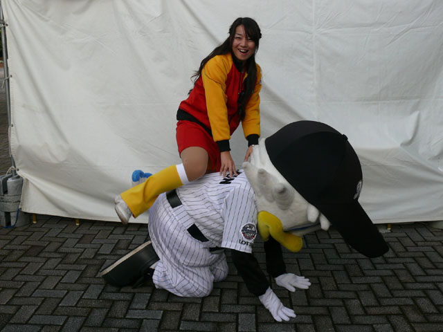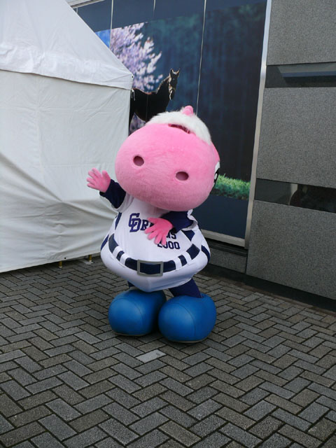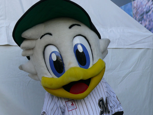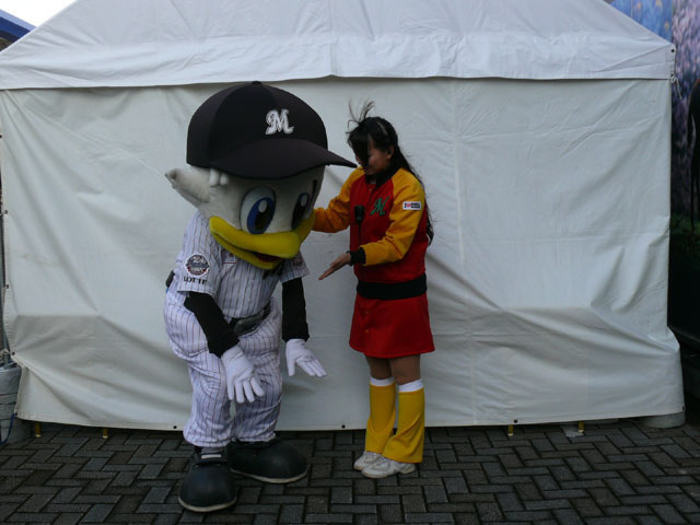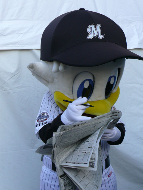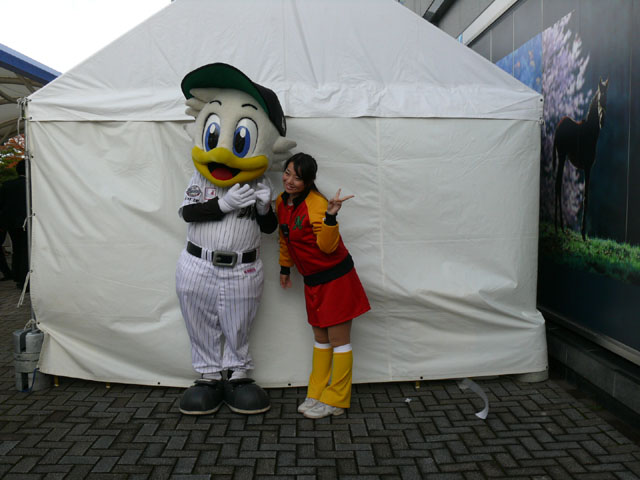 毛並みチェック。ハッキリと手形ついてるときあります、たまに。 午後からはマーくんとこなつおねーさんが登場。 ここでこなつおねーさんのマスコット使い能力発揮。 まさしくマスコット使いこなつおねーさん。 それともマーくんが素直すぎるのか。 で、どっかのおっさんが俺にも乗ってとか言ったとか言わないとか。 本当に馬券購入しているらしい。ドアラさんと一緒に。 ちょこっと目の間に土の色が。マリスタで今年もがんばりましたね。 パオロン登場。この日初めてお会いできました。 どんなポーズとっても絵になりますよ。 時間がないのか、パニックになるからなのか、ドアラさんは出てきませんでした。