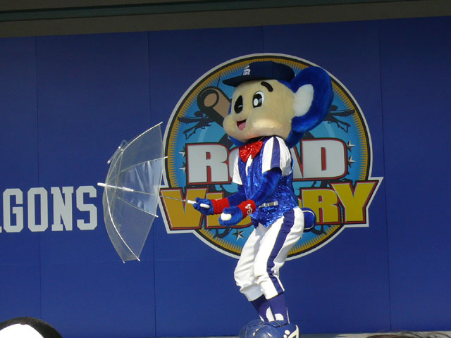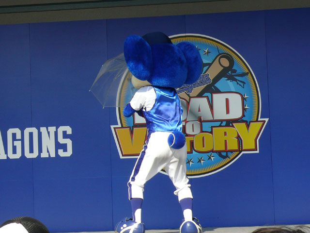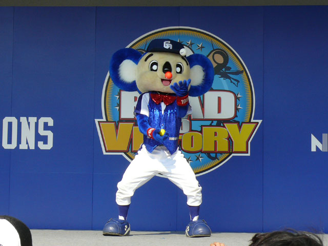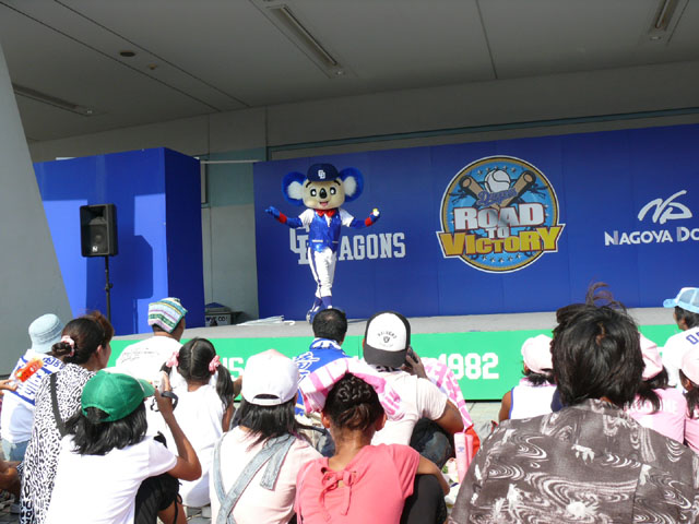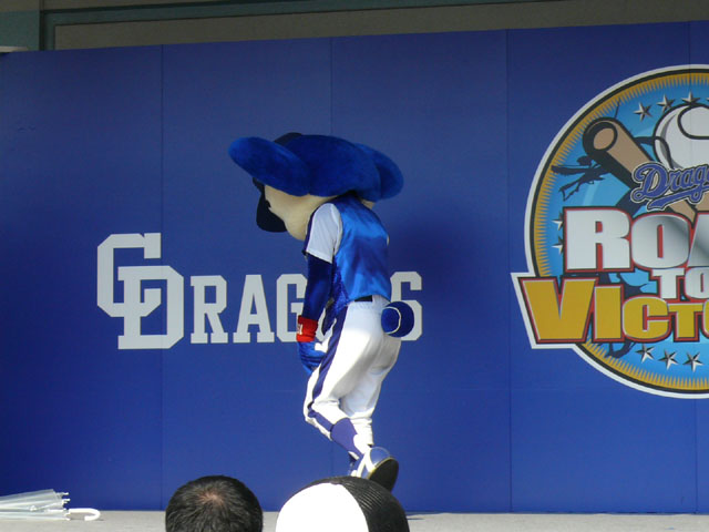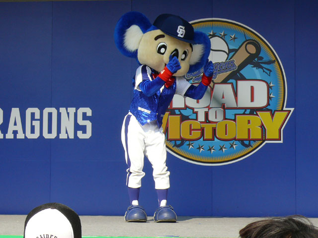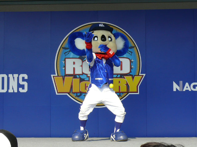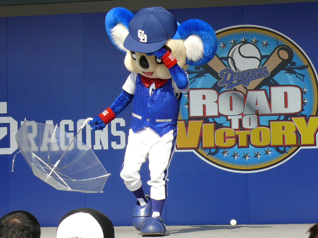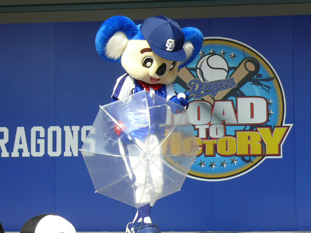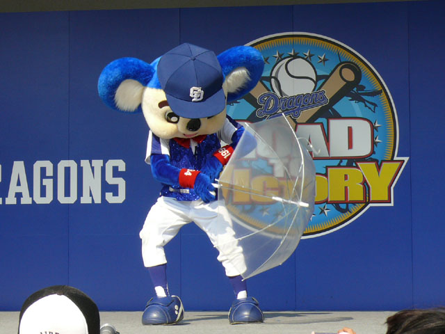 HAPPY SHOW TIMEとドアラデーイベントの合間にPRコーナー。三人三様のドアラ耳。 営業の水野さんがつけている青は通常販売、なおちゃんがつけているピンクはイオンナゴド前ショップのみ限定発売、いまちゃんがつけている黄金は去年の優勝限定発売で現在は入手不可。 ほしいという人はドラゴンズの優勝を祈りましょう。 耳つけているなおちゃんといまちゃんのアップ姿はまた別途更新時に載せますわ。 そしてインフォメーションコーナーが終わったら・・・。 エキセントリック少年ボウイが流れる!ちょっと、なんでその選曲なんですかっ! 個人的にはエキセントリック少年ボウイの後、いつものイベントのほのぼの音楽にかわるかと思ったけど、いつもの音楽じゃなくてなんか手品やりそうな音楽が流れ出し・・・。 出た!ドアラ! 手には3回裏のYMCA時にチアドラたちにバズーカで放たれるカラーボール(ドアラサイン入り) まさか、ジャグリングするんですか?できるの?? できてないっ!! 「あ、ひろってくれてどーも」 もう1回チャレンジ!いい感じ? やっぱり、できない。 なんか寂しげな。 カラーボールを放り、今度はビニール傘を拾う。 自分で開いておきながらビビるドアラ。 残っていた1個のカラーボールを。 いきますよ。 お、うまくいったか?? しかし大方のお客さんの期待どおりやはり失敗。 あれーカラーボールどこ? お子さんから「うしろ!」といわれてきがついて。 傘をしまいます。そんじゃ次はどうするのかしらん。 「おいといて」 ・・ってちょっ! というわけで続きます。 今からハリーポッター観にいってくる。2日続けてファンタジーずくめ。 多分今日はもっと更新すると思うけど、どの日どの場面から更新するかはそのときの気分次第。 おまけ。 知らない人も多いかもしれないので。 4/8シャオロンデーのときにドアラはこのベスト着用。大暴れしてシャオロンとパオロンとルミおねーさんが慌てて逃げていますw