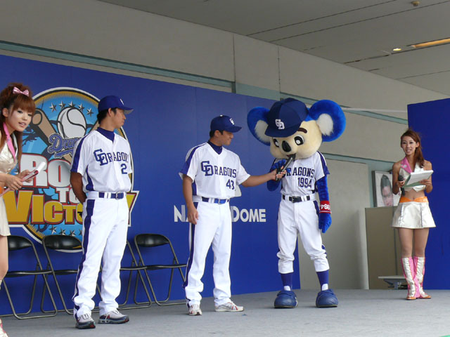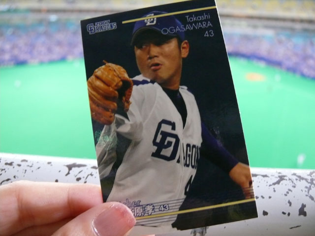 やまいちゃんと小笠原さんの登場でしたよ。 そういや今日の炎の火曜日ちゅーせんデーのカードはガサーラでした。ガサーラのカードを見て、「当たりだ」と思えるようになった今年は本当に飛躍しましたね。 やまいちゃん今年やっと芽が出てきたのは嬉しい。 本当に2人ともナイスピッチなんですよ。だからドアラにマイク食べさせてOK(? うーん・・打線だなぁ。今日はいばちんがブレーキすぎた。早打ちだし、粘れないし。よほど肩か肘が悪いのか。 守備は魅せてくれたんだけどね。好守からリズム作ってほしいな。 今日は一人でレフト側パノラマBでまったりしていたんだけれど、テンポよすぎて眠たくなってしまった。 最後満塁でもりのんの打順になったとき泣きそうになってしまった。 私はいつのまにそこまで森野ファンになっていたんだ? それにしてもベイで今日出てきた投手で一番打てそうだったのがクルーン投手だったとは。クルーンも勤続疲労出てきたか? 明日残業しようと思っていたのに、ナゴドにいるかもしれません。いやわからんけど。