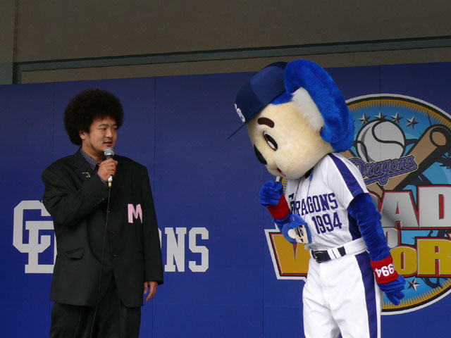 公式ブログでもマリーンズさんとこめっちゃ力入れてる気がするし・・・。 私は今年ナゴドにやってきてくれたパのどのマスコットも楽しくて誰がいいなんて選べないので、マリーンズだけじゃなくパリーグのいろんな球団ともっといろんなことやってほしいな。 交流戦は一種のお祭りだと思うし。(もちろん試合はお祭りではなくペナントレースの1試合ですが) ダンスバトルのMCにお邪魔するドアラ。 6/10 ロッテ戦 D-STAGE ちょこっとだけ。