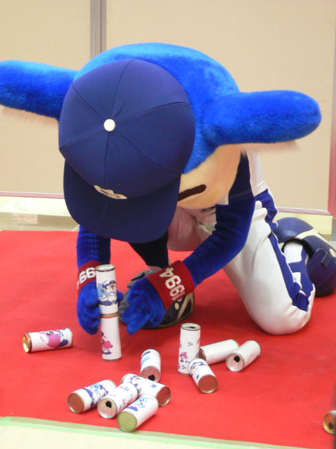 続いては、缶積み競争。会場で手を挙げた子の中からドアラが3人選ぶ。そしたら女の子ばっかり。司会のおねーさんに「ドアラ、好みで選んだ?」とつっこまれていたw