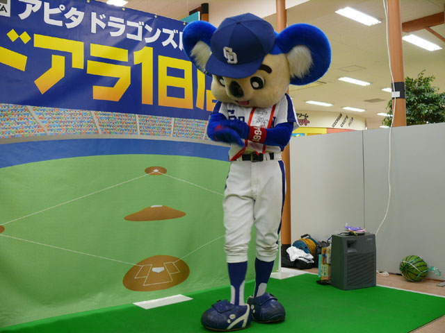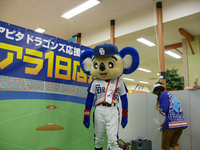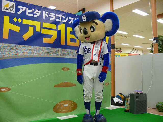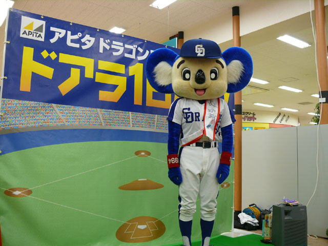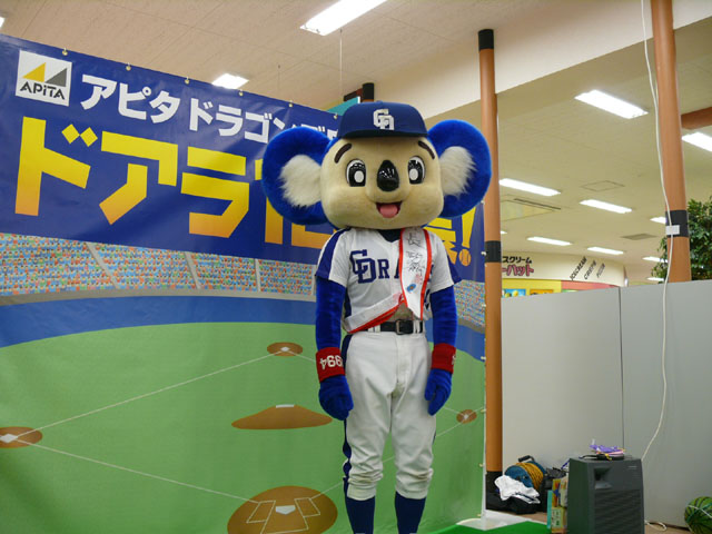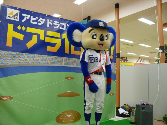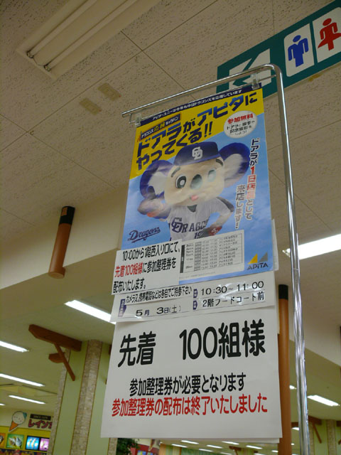 今日はドラやドアラとは全く関係ないところに外出してたんですが昨日はちょいとアピタ東海荒尾店に行ってきました。連休に阪神戦やられるとあっという間にチケット売り切れるんで私みたいに発売日を把握していない人は手に入らないのよねー。<発売日把握しとけよ