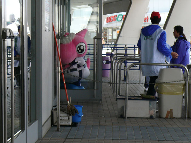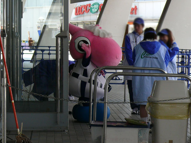 ドアラ、出てきました。 寒いせいか?ちょこっとチケットの係の人と話して(?)、すぐに帰っていきました。 反射が激しいですが、微妙に見えます。 パオローン♪気がついてくれた♪ パオロンも出てきました。 「お仕事おつかれさまです!」 やっぱり寒いので中に入りまーす。 さて、続いてはパオロンに試合前に「動画撮るよ~」と言って動いてもらいました。動画どうぞ。 カ、カワユス・・・。