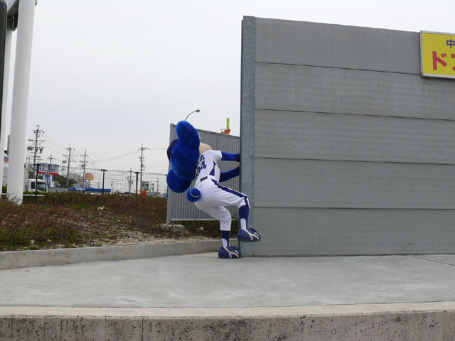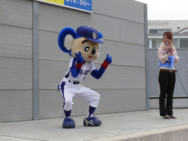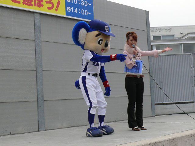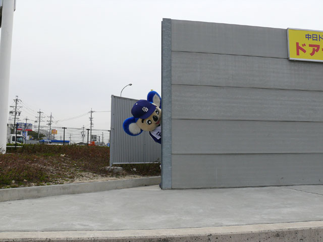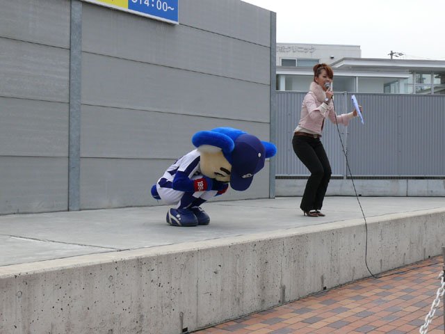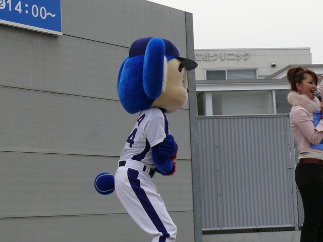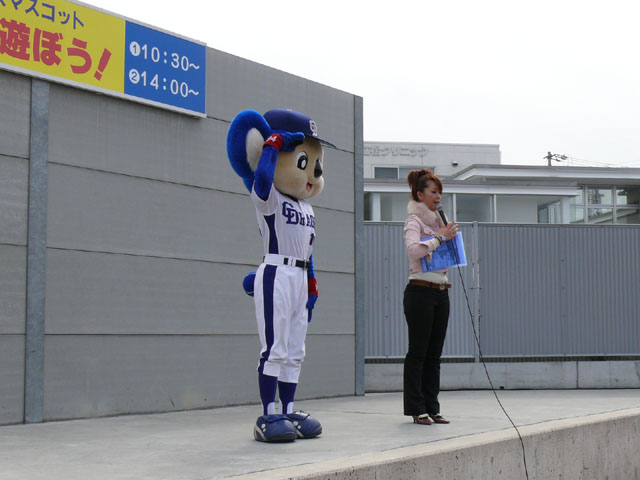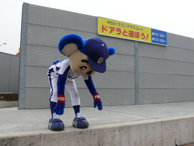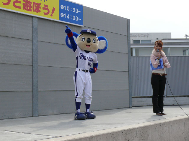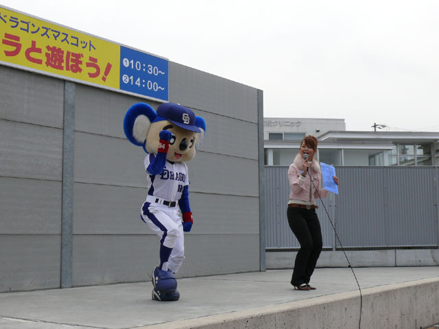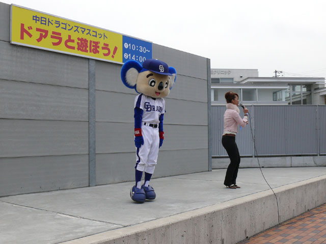 朝、私たちが着いたときは既にお客さんがたくさんいました・・・ので、端っこで撮影。 待ってる間にもどんどん人がやってくる。やっぱり日進で、名古屋近郊で来やすいのか?ドアラ認知度が上がってきたのか?ビンゴのチケット目当てか?(←おそらくそれっぽい・・・) 同時に「春の防火フェア」というものも行われていました。後ではしご車乗ろうとみんなではしゃぐ。 ドアラ、はしご車から現れてくれんかな~。 しかし、壁の奥からでしたw 勢い余って・・おっとっと。 お決まりのガニ股ダブルピースw たくさんのお客さんが集まっています。中央の席にはドアラの顔のかぶりもの? それにしても、日も出ていないから寒いね~。 微妙に浮いています。なにかの宗教ですか?? 寒さを和らげるために、みんなで準備体操やりましょー! まんまるドアラのしっぽ。 静止画だと全く伝わりませんorz ドアラ、すごーくゆっくり屈伸やっています。かと思ったらとても早く屈伸したりしています。 司会のおねーさん:「もうちょっと、普通にやろうね」 どう見ても普通じゃありません。そもそもどうやったらこんな動きになるんですか。 あったまりましたかー? さて、これから「みんなでまねまねドアラ」です。ドアラの真似してくださーい! みんなでまねまねド・ア・ラ♪ みんなでまねまねド・ア・ラ♪ みんなでまねまねド・ア・ラ♪ みんなでまねまねド・ア・ラ♪ みんなでまねまねド・ア・ラ♪ これかなりおもしろいね。ドアラのポーズ集ですね。 さて、しかしドアラのネタはどこまでもつかな? というわけで次はどんどん早くなります。動画でどうぞ。 司会のおねーさんがちょっと「どうしよう・・」と戸惑っているのが・・・w というわけで今日はここまで。続きはまた後日で。