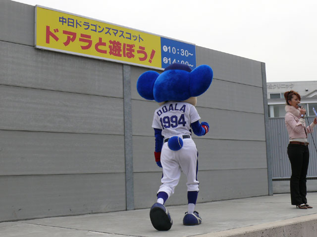 ドアラの登場シーンはどちら側から出てくるかを予想して構えるカメラがたくさんあって笑えました わたしは動画にしていたので思ったほうから出てきて一安心でした 着いたときはまぁまぁいい天気なのに、あっという間に雲が出て寒くなってきたのには参りました 準備体操や「みんなでまねまねドアラ」は面白かったですね 正面から撮ったわたしの動画には、ドアラをじーっと見つめるだけの子供が映ってました(笑)