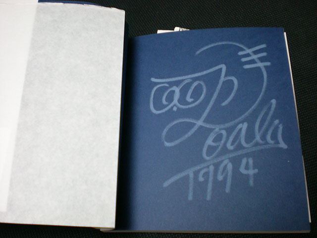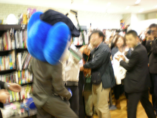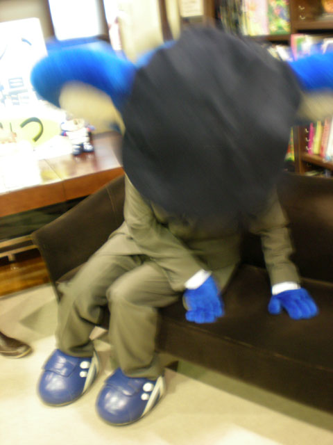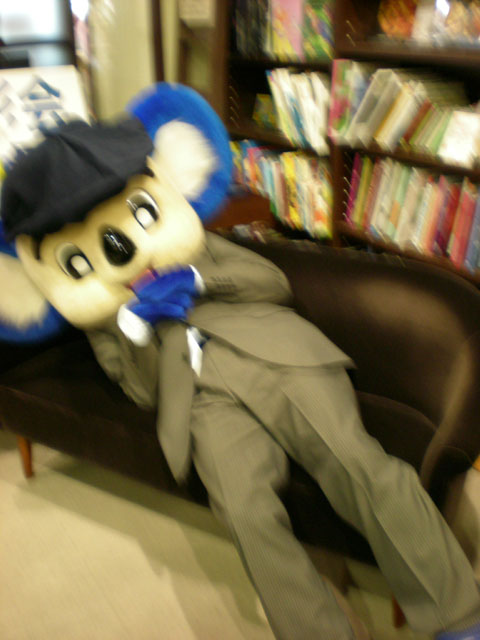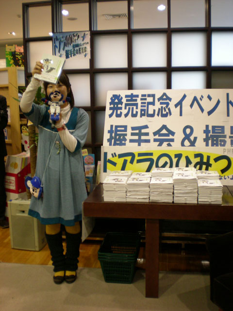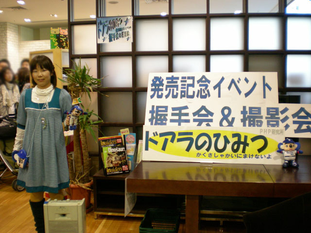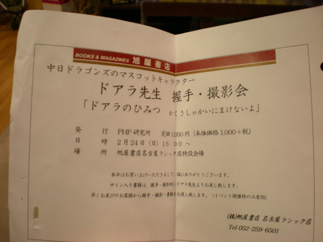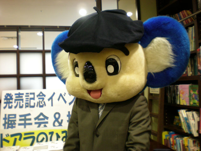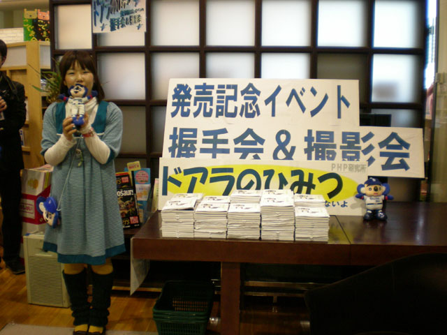 お菓子でも差し入れに持っていこうかと思いましたが、既に前日いろんな会場で食べ物の差し入れ貰ってるらしいとのこと。じゃあ食べきるのも大変かもね。 と、ラシックのB1Fウロウロしていて、ミネラルウォーターのお店で¥420-の水を購入。水にしては高い。 イベント終わってから喉潤してください。 受け取ったあと折って鞄に入れていたのでヨレてしまった整理券。代金と引き換え。無事手に入れることができてヨカッタ。 先生と2日間行動を共にしているルミおねーさん登場です。おつかれさまです。 愛知テレビさん、きてます。 ドアラ本についての注意事項を説明してます。 「サインした文字が写らないように白い紙が入っていますのでその辺に捨てたり落としたりしないでください」 「先生が家に持ち帰ってサインしたので、もしかしたら字が変になっているものもあるかもしれません」 「ひょっとしたら食パン食べながらサインしてるかもしれませんのでパンくずがはいっているかもしれません」 「途中電車で読んだあと置き忘れないでください」 等等。 そして本の内容について1つだけ訂正 「パオロンはシャオロンの妹となってますが、ドアラが勝手に書いたことなのでそういう設定はありません」 「パオロンとシャオロンはおともだちです」 「ドアラは自分の興味ないことに関してはどうでもいいみたいです」 「これは公式の本なんですがそれだけは訂正してまわらないといけません」 そうでしたかw ドアラさん、シャオロンとパオロンに興味ないですかw そしてルミおねーさん、なかなか「ドアラ先生」と呼ぶことができないそうでw 「先生」とならやっとなんとか言えるようになったとか。前に「ドアラ」をつけると駄目らしいw ところでドアラがなかなか現れません。 ルミおねーさんのトークで5分くらいつなぎました。 そして後ろのほうで歓声がどんどん近づいてきて。 急いで先生登場。 迷わずソファに横になる。 用意されたソファの座り心地を確認。 噂のベレー帽姿。なんですか妙に似合う。 さてドアラ先生。ここにきた用事を思い出してください。 始めますか? じゃあここにお客さんに座ってもらって。 で、ドアラ先生から本を手渡しされて記念撮影。 「書斎の本棚の前のソファでのツーショット」という写真が撮れましたw 会場は狭くて人だかりですぐに出なければいけなかったけれど、本当に撮影してもらった写真が雰囲気出てておもしろい。 個人的にはこの場所、ヨカッタです。旭屋書店さん。 写真撮り終えた後何故かドアラに鼻つままれました。いろいろアタマ叩かれたり足踏まれたり指差されて笑われたりしたことはありましたが鼻つままれたのは初めて・・・。 こちらサイン本。キチンと書いてくれているものに当たったらしいw 見えなかったですが旭屋書店さんから花束贈呈されていた模様。 そして差し入れもたくさんいただいていました。 いい忘れたけれど、ドアラ先生ご出版おめでとうございます。 びっくりしたのは、お店の前にディスプレイされていたドアラ本。来たときは50冊くらい?あったのに、イベント終了時には完売していた。 なにそれ。