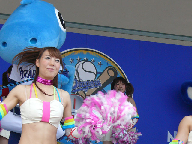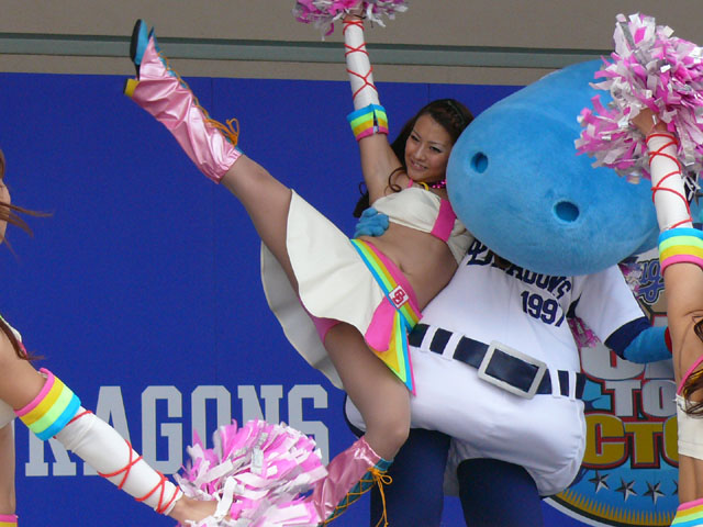 携帯サイトのドラゴンズ情報(有料サイト)に、チアドラゴンズ日記があるんですが、そこに掲載されなかった日記がドラゴンズオンラインマガジン(これまた有料)のチアドラボツ日記に掲載されてます。 (6月までしか載ってないんで、早く7月、8月見たいんですが石黒さん) で、そこで佐藤綾乃ちゃんの「シャオちゃんのおなかを叩いて怒らせちゃいました~」っていう日記がありました。 佐藤綾乃ちゃん。今年のチアドラのなかで一番背が高い子です。 で、大分前のことなんですが、シャオロンに「あやのちゃん許してあげなよ~」と言ったら。 「いやいや、アイツは、シャオのおなかを、グーで、バンバンバンバンと、4回、叩いた」 と、ジェスチャーで答えてくれたw なので、「ちっちゃいことは~気にするな~♪」(←シャオロンデー後)と言ったら、 「ちっちゃくない!ちっちゃくない!」 と首と手を振り、大否定してくれた。 おなかはでかいよ。 でもそこはメインマスコットとして寛大なココロを持ってあやのちゃんと仲良くしてよと言ってみた。 で、先日、あやのちゃんと話す機会がありまして。 あやのちゃん、シャオロンと仲良くやってる?と聞いてみました。 そしたら、あやのちゃんめっちゃ顔しかめてて。あぁ、仲良くないんかいw あ:「でも最近ちょっとシャオロン優しくなってきました、でもこの前JOYRIDEでタオル当てたからまた怒ってるかも~」 あ~、また根に持ってるかもしれんあの小龍。 そうだ。 私:「ねぇ、今度のD-STAGEでシャオロンに持ち上げてもらったら?」 あ:「え?160cm以上ありますよ?」 私:「大丈夫だよ、シャオロン力持ちだから!」 このシーンね。(持ち上げられているのはまみちゃん) シャオ様ならきっとあやのちゃんも持ち上げることができると思うんです。 で、そのことをシャオロンに、その日の試合終了後のグリーティングで話してみる。 私:「シャオロン、今度のD-STAGEであやのちゃんを持ち上げてよ!」 シャ:「!」 シャオロン、しばし固まってから、腰をトントンと叩く・・・・・・ 腰痛めるんかい! いやいや、D-STAGEが9/26、27と追加で開催されることが決まりましたから! 是非、シャオロンにあやのちゃんを持ち上げていただきたいです。 いろいろと、水に流してw シャオロンとあやのちゃんが仲良く踊るところを見てみたいよ。
