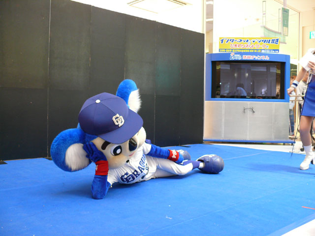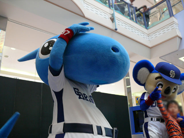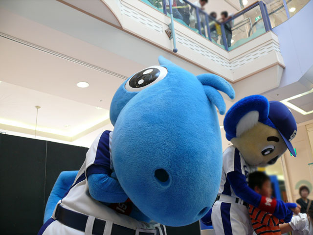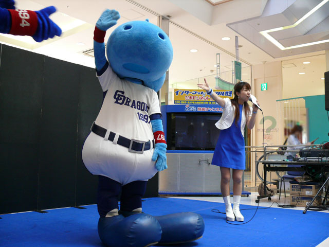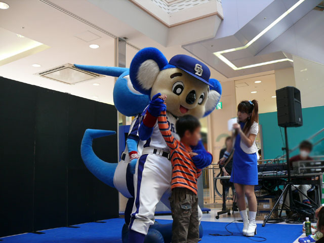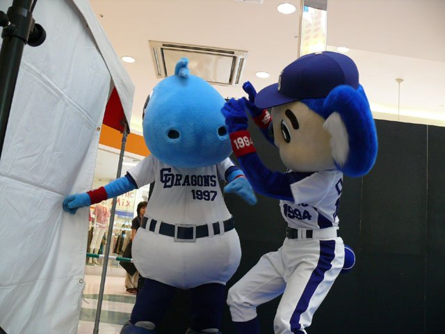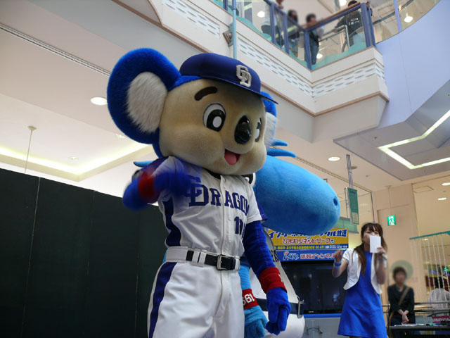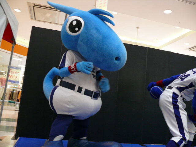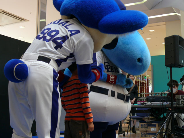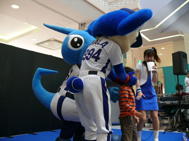 司会のおねーさんから「2階のお客さんは身を乗り出したりしないで!できれば1階で楽しんで!」等の注意事項が発表されてから。 出てきました!今回は会場の隣にテントがあるので、「どこから来る?」とキョロキョロする必要なし。 そしてそのままバク転をして! ・・・・・・・。 ・・・・・・・。 つづいて、シャオロンの登場。 ドアラ、阻止しようとしてますw 今日はシャオロンもいますよ。 頭を低く、よろしく。 まずドアラとシャオロンを知ってもらうためにクイズからはじめます。 まず第1問! ドアラはコアラですが、シャオロンはなんでしょう?3択です。 「龍」と、ナントカと・・(はくばさんフォローお願いします あと「カバ」という選択肢でコケるシャオロンw ドアラがコアラならばシャオロンはカバ?? わかる人~? ドアラの手(非製品)高速移動。 シャオロンが当てた子の邪魔をするドアラ。 少年、「龍」と答えてくれます。 答えは?シャオロン。 「マルっ!」 ドアラ、二人羽織ちっく? シャオロンポストカードにシャオロンがサインをしてプレゼントです! 今日はとりあえずここまで。 続きはまた後日。