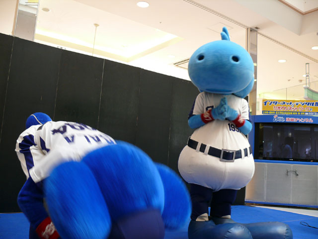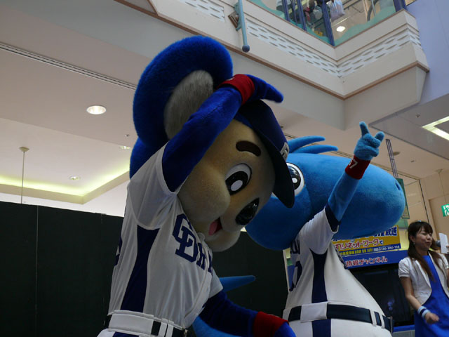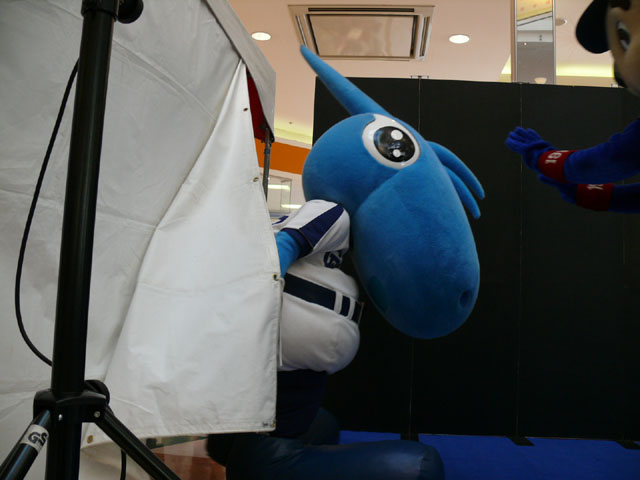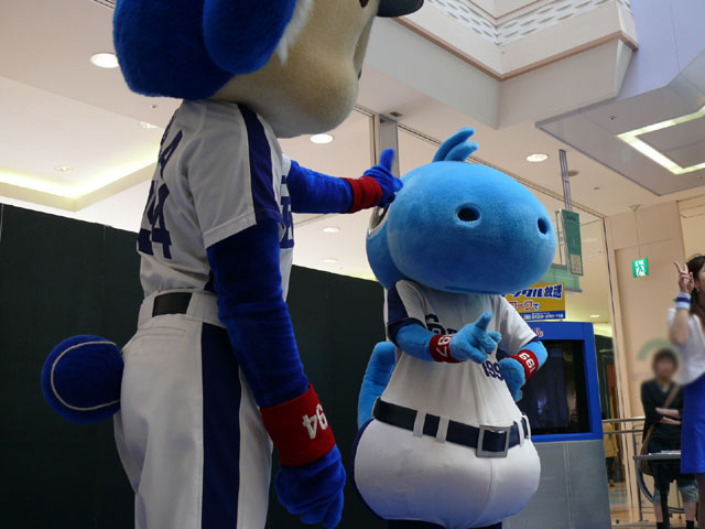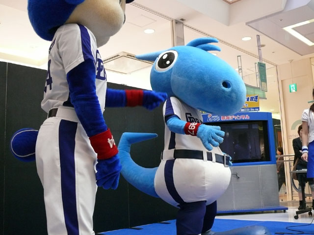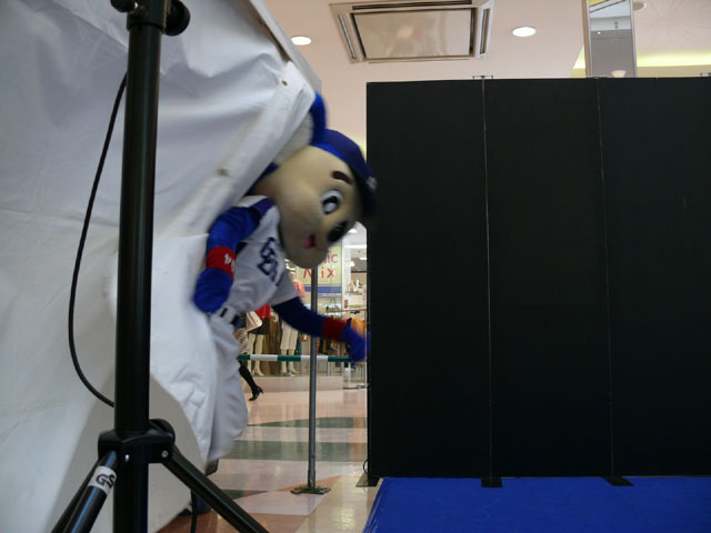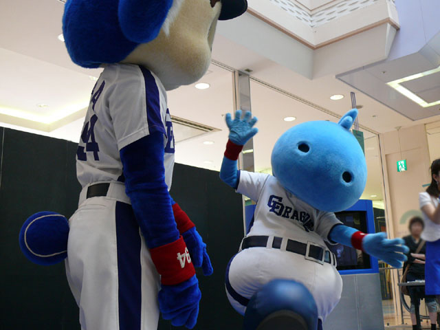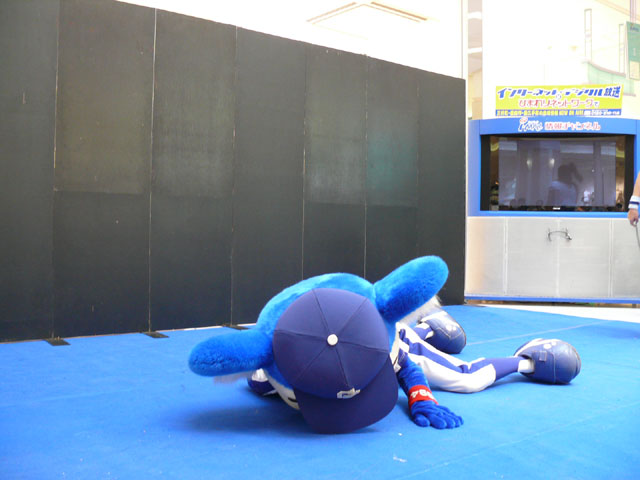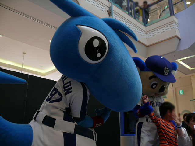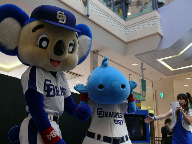 司会のおねーさんから「2階のお客さんは身を乗り出したりしないで!できれば1階で楽しんで!」等の注意事項が発表されてから。 出てきました!今回は会場の隣にテントがあるので、「どこから来る?」とキョロキョロする必要なし。 そしてそのままバク転をして! ・・・・・・・。 ・・・・・・・。 つづいて、シャオロンの登場。 ドアラ、阻止しようとしてますw 今日はシャオロンもいますよ。 頭を低く、よろしく。 まずドアラとシャオロンを知ってもらうためにクイズからはじめます。 まず第1問! ドアラはコアラですが、シャオロンはなんでしょう?3択です。 「龍」と、ナントカと・・(はくばさんフォローお願いします あと「カバ」という選択肢でコケるシャオロンw ドアラがコアラならばシャオロンはカバ?? わかる人~? ドアラの手(非製品)高速移動。 シャオロンが当てた子の邪魔をするドアラ。 少年、「龍」と答えてくれます。 答えは?シャオロン。 「マルっ!」 ドアラ、二人羽織ちっく? シャオロンポストカードにシャオロンがサインをしてプレゼントです! 今日はとりあえずここまで。 続きはまた後日。