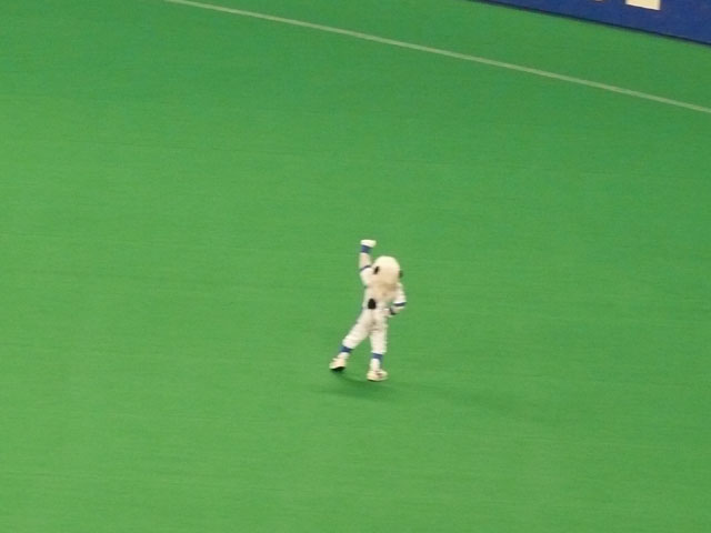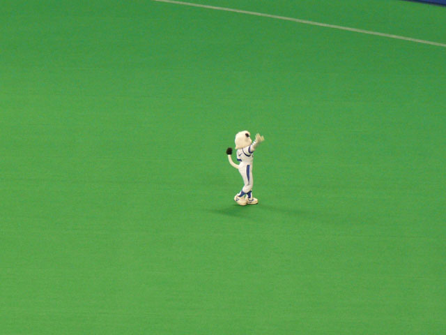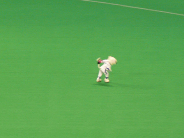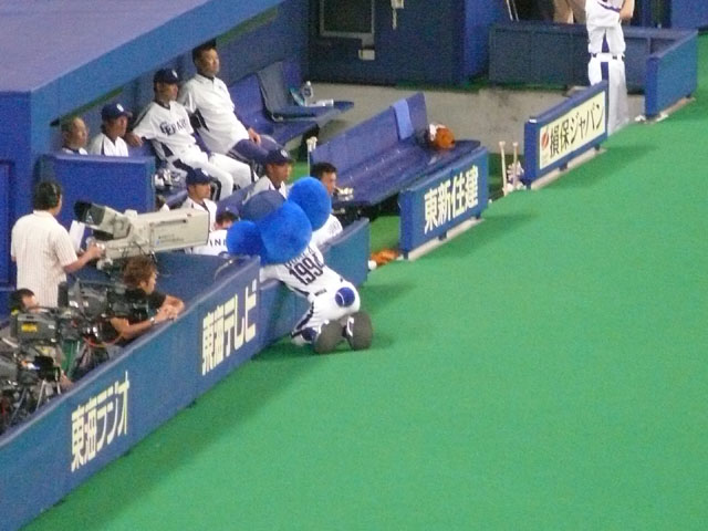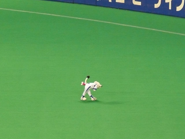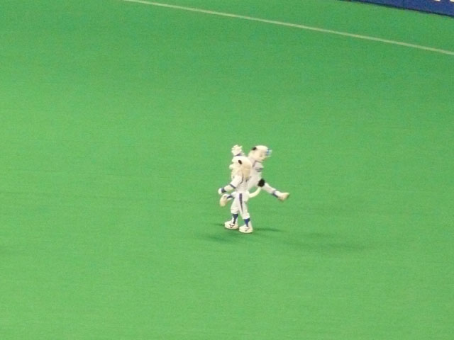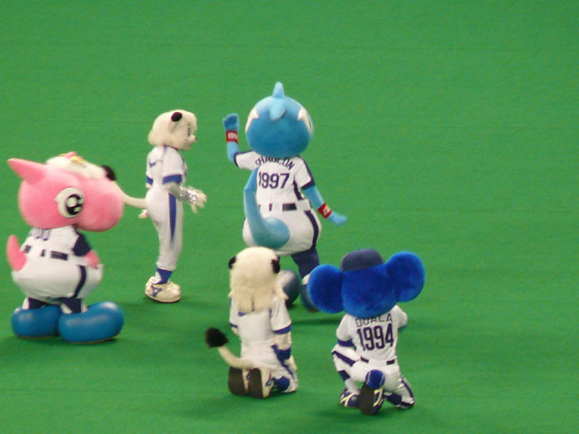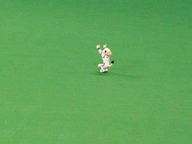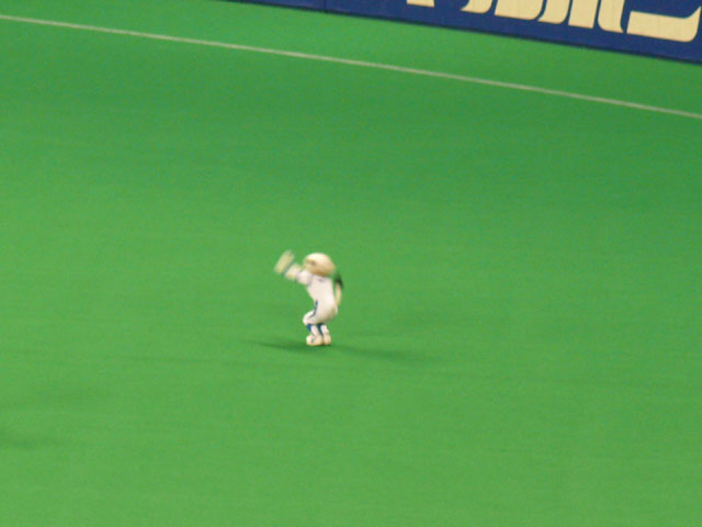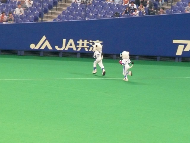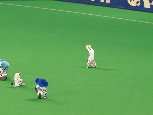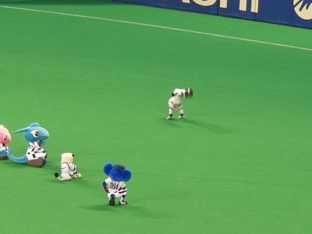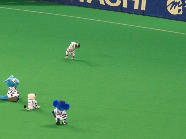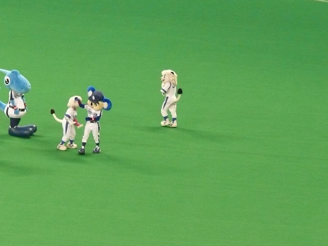 ライナちゃんが体操座りで見るなか(ドアラは違うが・・)、レオが跳ぶ跳ぶ! おぉ、何回転だ?かなり回ってましたレオ。 ライナちゃんが飛び出てきました! 12球団マスコットの女の子キャラの中で唯一ライナちゃんはアクロバットをすることができるみたい。 グリーティング時にライナちゃんに「バク転できるの?」と聞いたら、西部マスコット担当のおねーさんが「ライナちゃんは練習中だよね」と答えてくれました。 1回転してくれました!(瞬間逃した・・・orz いやしかしラブリーだ。 そして次はシャオロン・・・ってええええっ!? オープン戦やシャオロンデーのときのシャオロン大回転再び? これは動画で撮影せねば。 あれ、肩透かし・・・。 で、でもパオロンが!? こちらも動画でどうぞ。 レフトスタンドを煽るパオロンも、シャオロンに衝突して足をばたばたさせ、レオライナに助けられるパオロンもどれもかわいい。 しかしドアラ冷たいぞw ちなみにYouTubeとFileClipの使い分けは・・動画サイズでなんとなく振り分けてます。 ドアラは一足先にベンチへ。 レオとライナちゃんは3塁側へ。 こうやって見るとレオってライナちゃんと身長そんなに変わらないのね。 そして試合が始まりますよ~。 試合中のレオとライナちゃんたちはまた後日~。 おまけ。 気になる人も多いんじゃないでしょうか。どうするんだろこの看板・・・。