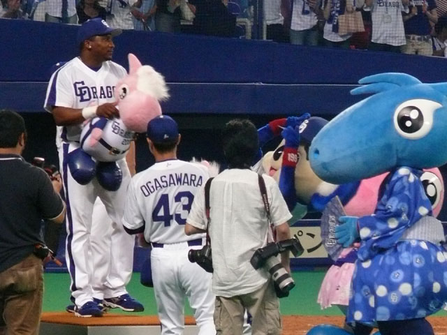 何が起こったかというと。 7回の谷繁さんの打席のとき。 ファールボールが1塁側に飛んできて。 女性の方が素手で捕まえようとして思いっきり頭に直撃していました・・・。 私の座っていた上部のへんの出来事なので直撃を思いっきり目撃してしまいました。 どうやら担架で運ばれていった模様。 プロ野球選手の打ったバウンドなしの強い硬球なんて女性が素手で捕るなんてほぼ不可能だと思うし、何よりも危険ですよ・・・。 ファールボール飛んできたら避けましょう・・・。 それでは、気を取り直して。 ドアライズムがライナちゃんだけじゃなくてそうえもん殿にも。ガニ股ダブルピース。 1ゲートにてSANAさんが発見!パオさんにまだおまんじゅう持っていってないや。 シャオロンの書いた短冊はありませんでした。 相変わらず、ずるいですw 試合終了後下に降りたらなおちゃん気がついてくれた♪ ドアラさん、パオロンぬいぐるみでタイロンにどつかれていましたw ひゃっほい♪気分良くオールスター休みが迎えられる♪ 折角の良席だったので選手も写したりしてるし、動画も撮ってるのでまた後日UPしますね。 選手の写真は早目がいいかな・・・。 そんではおやすみなさい。