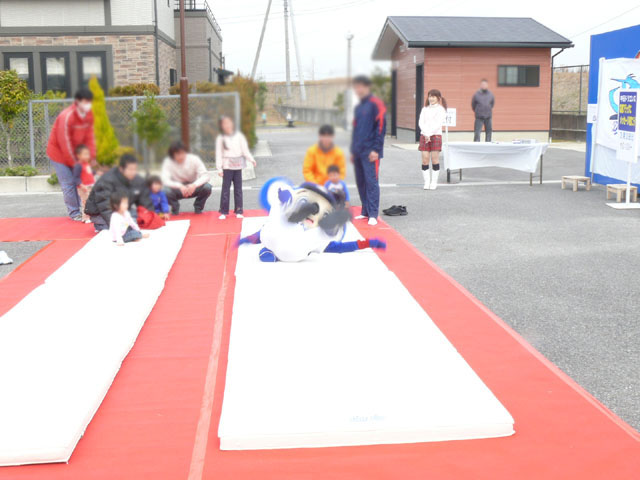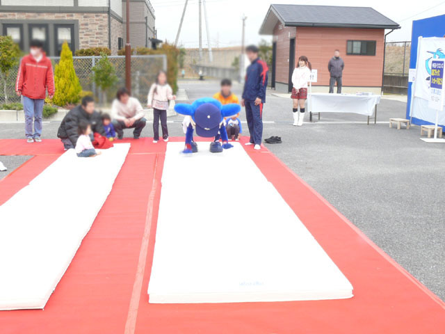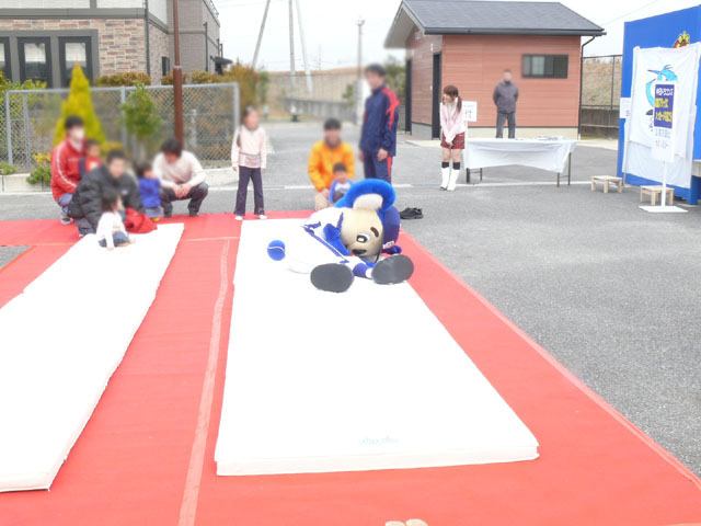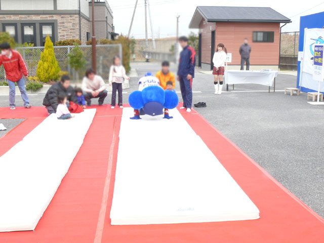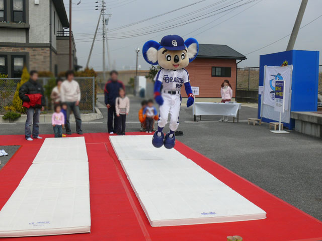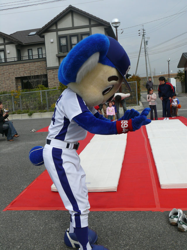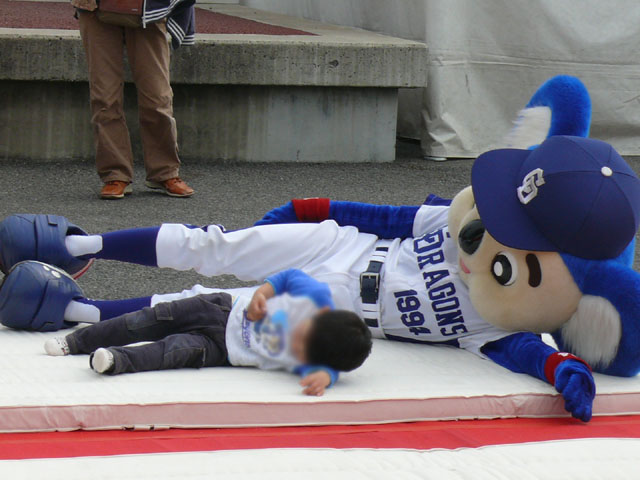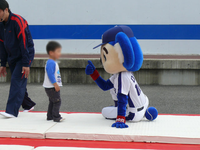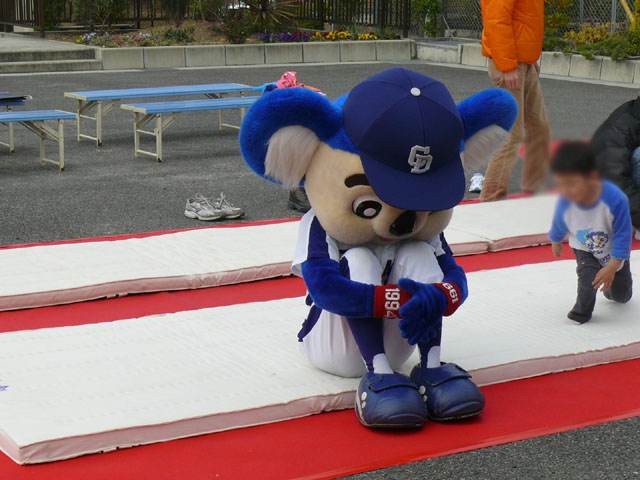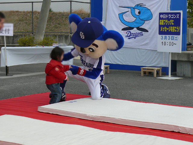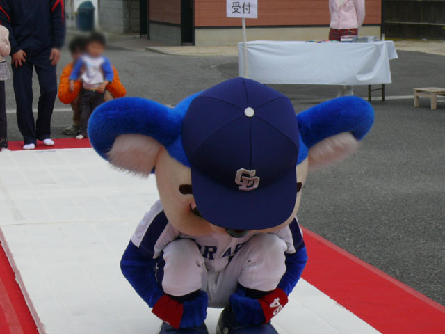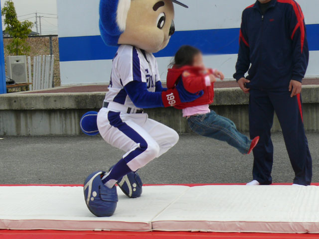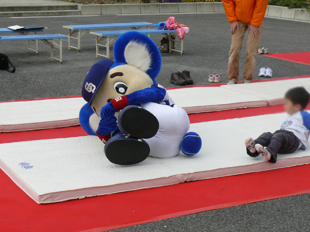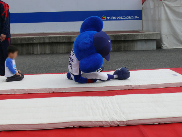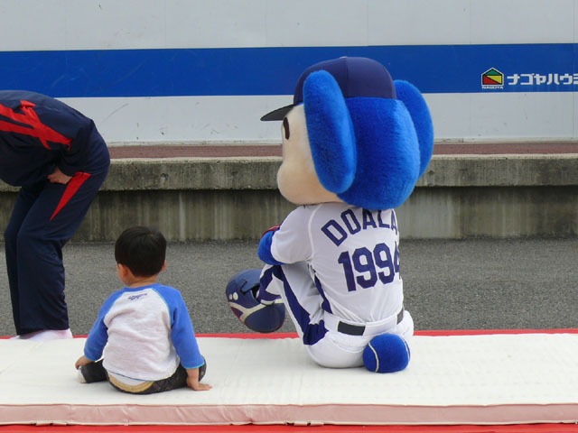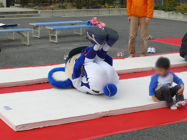 お子さんたちがノッてくれなかったのでヘコむドアラ。ドアラはがんばった。と思う。 体操のおにーさんと同時バク転。ドアラちょっと手ついちゃった。 「バク転できる人~?」アナタくらいしかいません。 ステージの下に下りてドアラも一緒に体操教室やりますよ。 ほのぼの。 決して人攫いではありません。 次の女の子に泣かれてうろたえるドアラ。恒例行事。 この男の子はドアラをじーっと見ていました。 じーっと見てます。 し、しっぽが・・・! 体操座りをしたまま、後ろに転がり、起き上がるという運動、ドアラの見本。これ、ドアラ苦手だよね? やっぱり起き上がれませんw 流れる動きでヘコみ入りました。 お子さんはかわいいが、ドアラは・・・。 続いては、マットの上をジャンプして前に進んでいきます。まずドアラがお手本。 うさぎ跳びの変形?? やり直しを命じられましたw やっぱり高いジャンプだよね。 そしてベビーカーのお子さんを泣かせましたw 次は、これまたドアラの苦手な前転。前回り。またドアラのお手本。 行きました・・・! やっぱり、コケました・・・! そして最後には修了証書が渡されます。人数は少なかったけれど、最後までとてもほのぼのとした体操教室でした。 人数多いほうが盛り上がるけれど、このまったり感も好き。 最初にドアラみて泣き出しちゃった子に、おそるおそる手を差し出す・・・。 最後はバッチリ!仲良くなりました♪ そしてステージに上がるドアラ・・・ポーズ決めてますが逆ですよ。 キ、キモカワイイ・・・! それでは、次は午後の部で遊びましょ~! 最後にバク転! と、これでドアラは退場。残念ながら直接絡む機会がありませんでした・・・。午後の部に期待。 なんか勢いあまって午前の部を一気に終わらせてしまいました。 昨日のオープン戦も少し、また後で更新します。