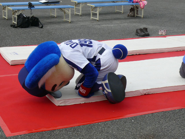 一生懸命準備体操してるのに、誰も真似してくれなくて怒るドアラ(笑) お子ちゃまが少ないからなぁ・・・厳しいね ドアラの横をずーっとキープしてドアラを見てるお子ちゃま 何を想っていたのだろうか(笑) そして相変わらず前転できないドアラ いやいいよ・・・それがドアラだよ(爆) せめてバック転は成功させてね♪