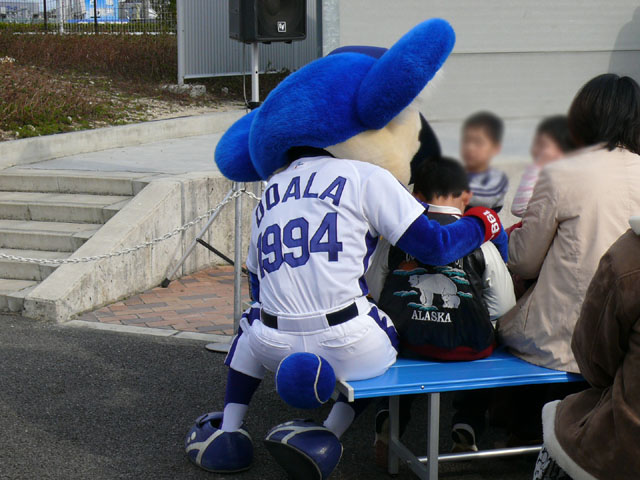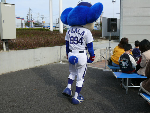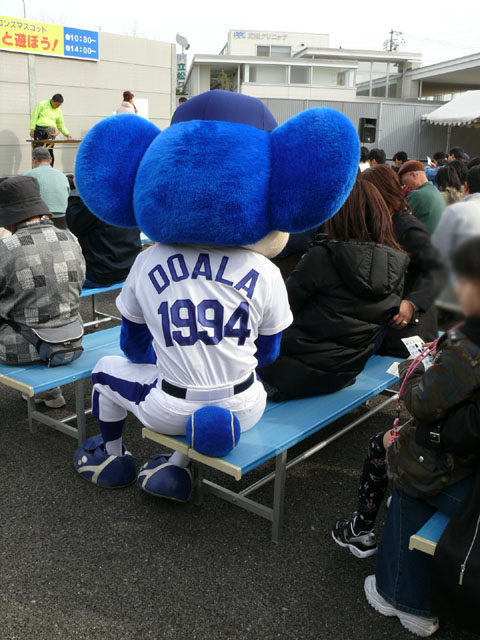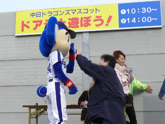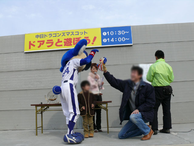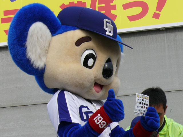 次はドアラ、こっそり客席へ。 しっぽが・・・! ドアラに「しっぽ!」といったら、両手でしっぽいじってくれましたw 「調子はどうだい?」 そして「ビンゴー!」とどデカイ声が。ドアラ、びくんと立ち上がる。 一番最初のビンゴが・・・yasu_no5さん! ・・・の、お子さんです。お父さん、インパクトありすぎ! ドアラとハイタッチ! yasu_no5さん:「ドアラ、鼻に傷が・・・」 ちなみにこのとき、同時ビンゴされていた方がいらっしゃって、希望チケットはブッキング。んで、負けてましたyasu_no5さんw これを区切りに、どんどんビンゴする人がでてきましたよ。 そして、「とある方」もビンゴしました! とある方のビンゴカードを持って記念撮影。 今日はちょっと少ないですが、この後の出来事はちょっと次の日のナゴドとリンクさせたいので、また後日。 開幕3連戦のうちに更新できるかどうかは疑問です。