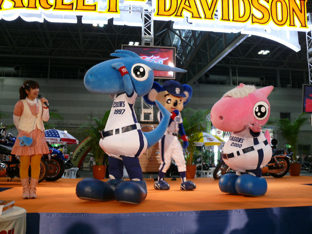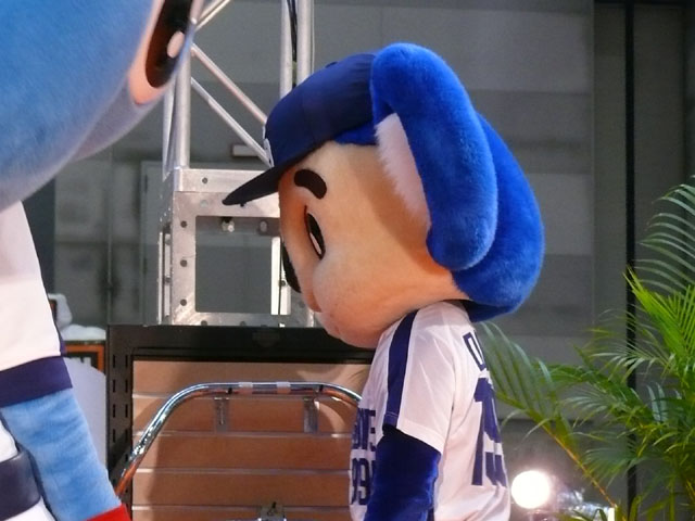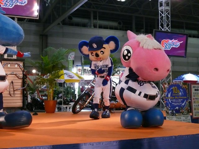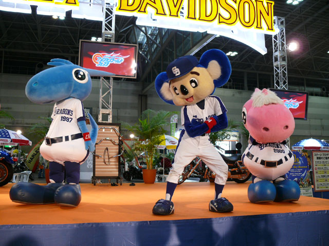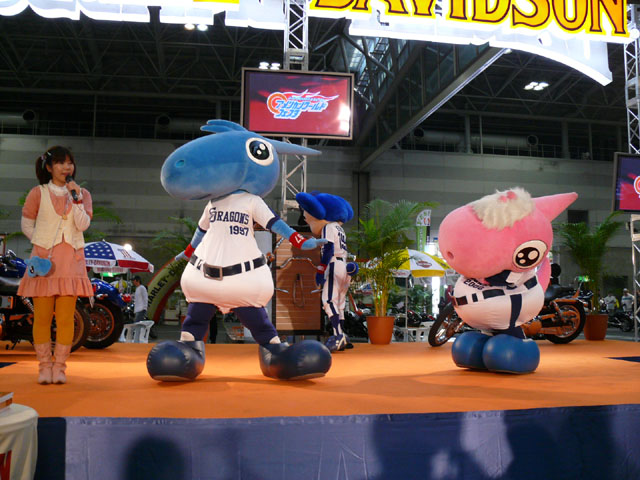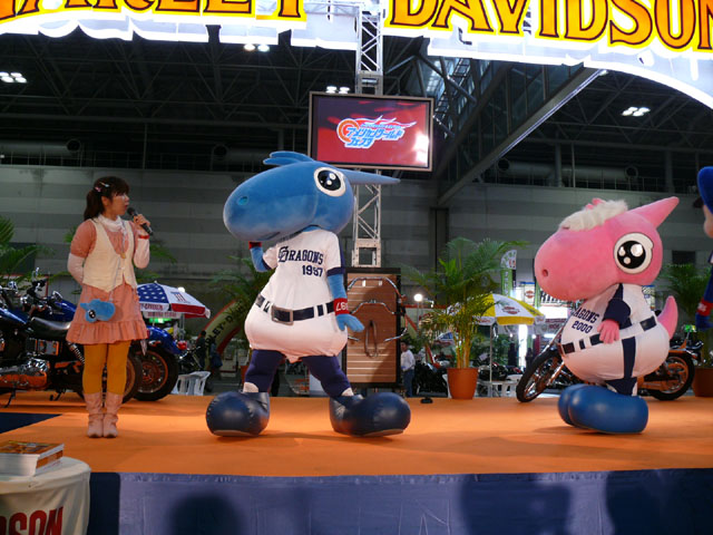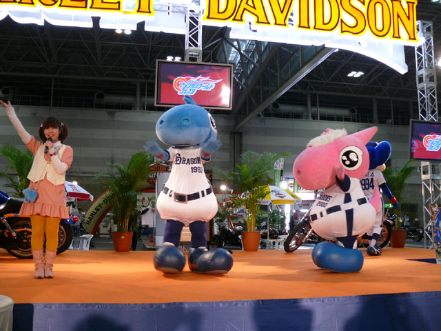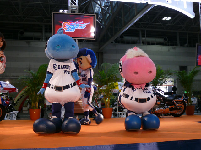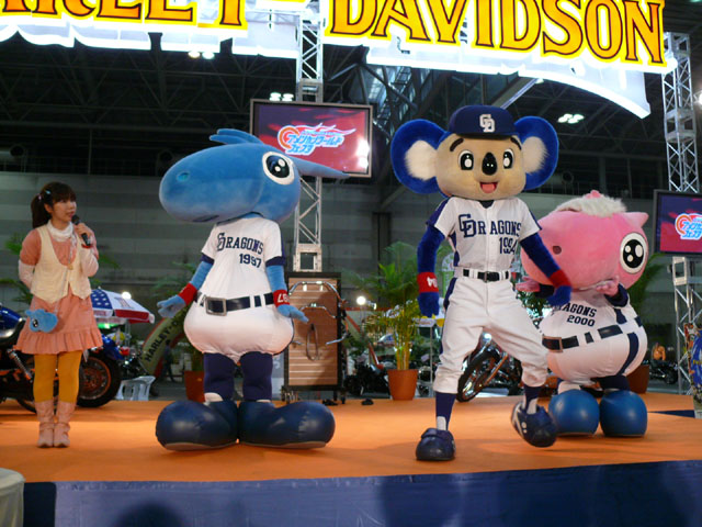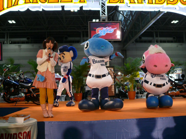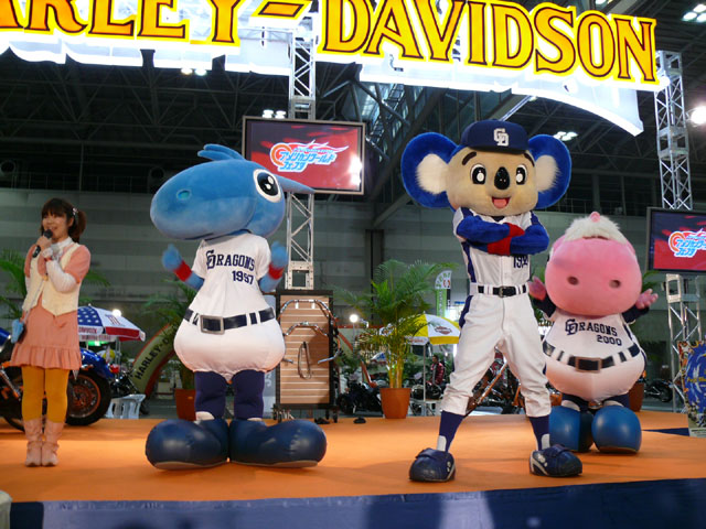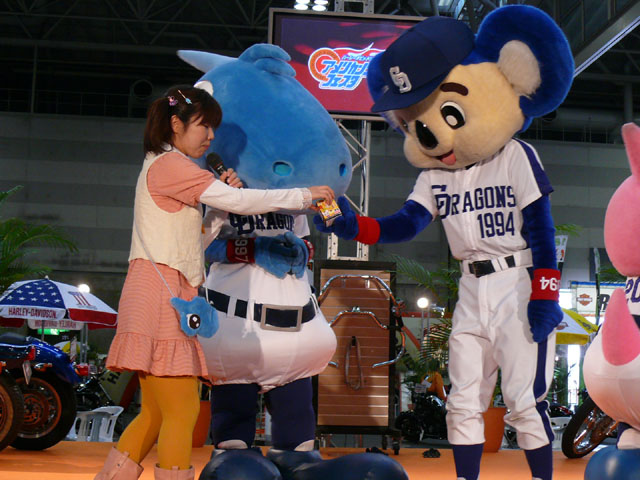 みんな舞台にあがります。 そしてご紹介されます。 やってこないドアラと対照的なシャオ様。2度目のぺこり。 ハーレーに興味を示すドアラ。 呼ばれてやっとやってきました。 で、早速ですがクイズやりますよ。 で、「シャオロンは一体何の動物でしょう?」という問題でしたっけ。 後ろにあるのが何か気になるドアラ。私はドアラが気になる。 真面目にかわいくステージを華やかにしているりゅうさんたちと対比で後ろの自由なコアラ・・・。 コアラさんいなくてもあまり差し障りなく進んでいます。 しかし一番自由に動けるので正解したお子さんにプレゼント渡してきてね。 なんか照明がキレイでよく撮影できる。 腰のラインが素敵。