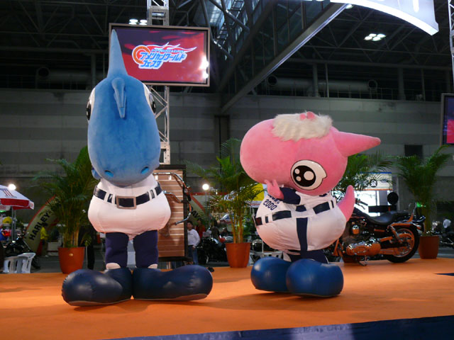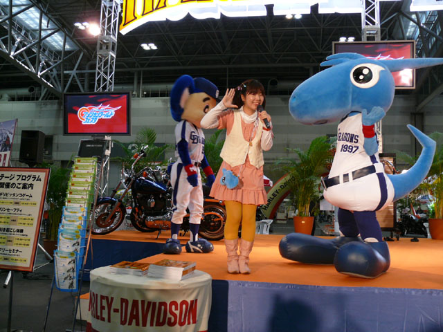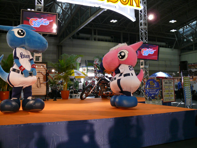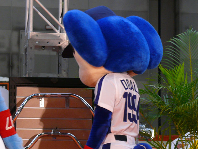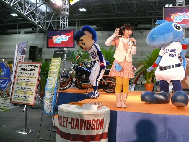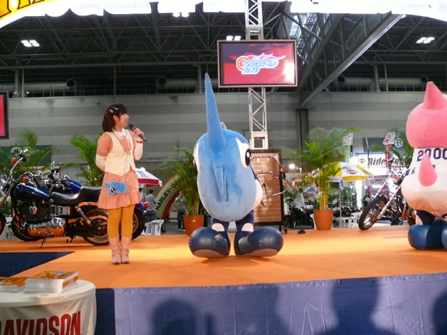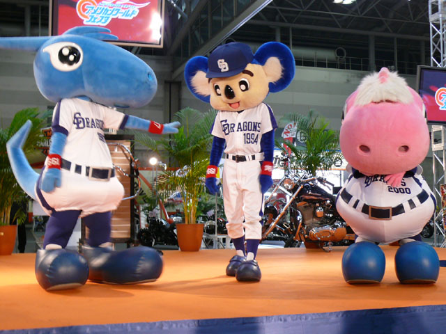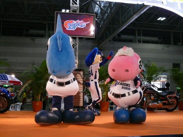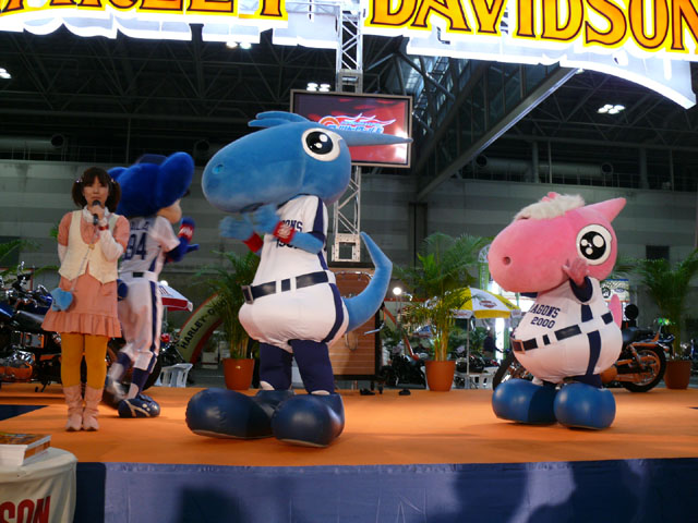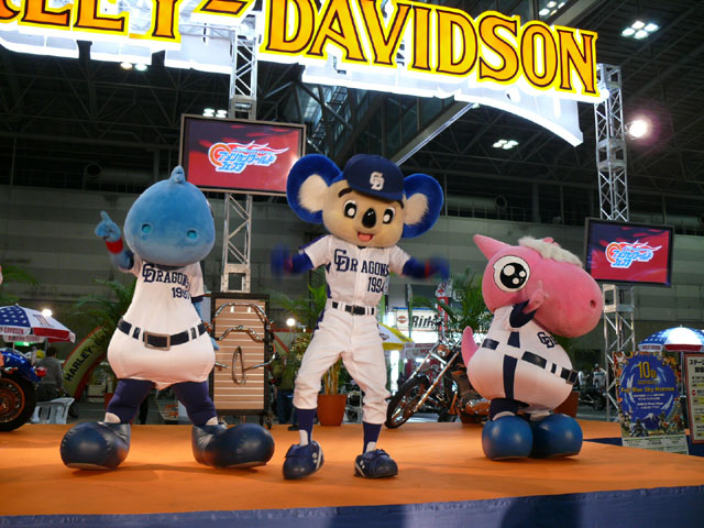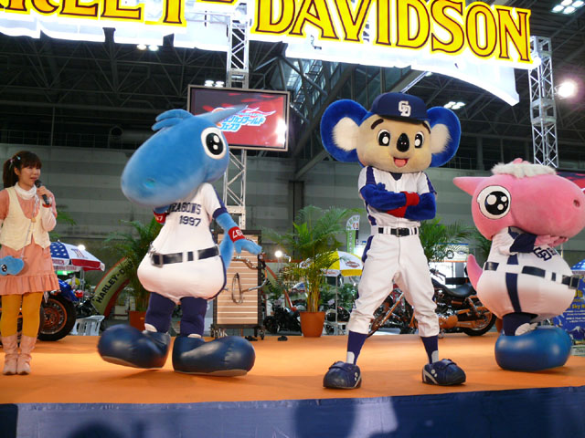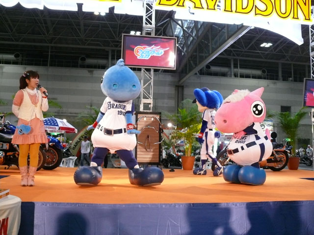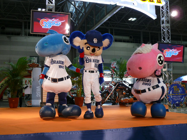 みんな舞台にあがります。 そしてご紹介されます。 やってこないドアラと対照的なシャオ様。2度目のぺこり。 ハーレーに興味を示すドアラ。 呼ばれてやっとやってきました。 で、早速ですがクイズやりますよ。 で、「シャオロンは一体何の動物でしょう?」という問題でしたっけ。 後ろにあるのが何か気になるドアラ。私はドアラが気になる。 真面目にかわいくステージを華やかにしているりゅうさんたちと対比で後ろの自由なコアラ・・・。 コアラさんいなくてもあまり差し障りなく進んでいます。 しかし一番自由に動けるので正解したお子さんにプレゼント渡してきてね。 なんか照明がキレイでよく撮影できる。 腰のラインが素敵。