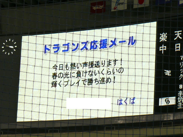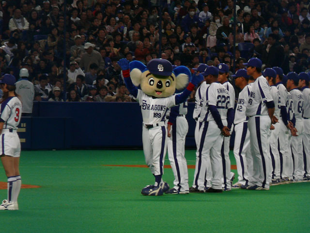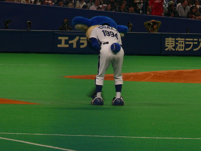 行ってきましたナゴヤドーム。楽天戦。混んでると予測したのと友人を振り回しすぎるのも良くないので、1ゲートグリーティングはパスしました。 でも試合開始前とか試合中とか試合後とかはドアラとシャオロンの追っかけをしていました。 とにかく、ドアラとシャオロンに気がついてもらえれば満足なの。 公式ブログでも載っていた新入団選手披露の瞬間。 ドアラは私を見てくれたに違いない。<思い込み