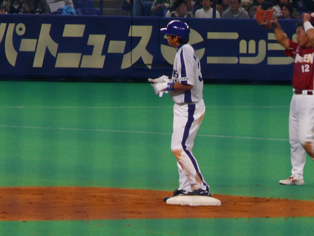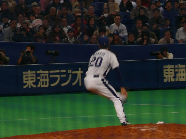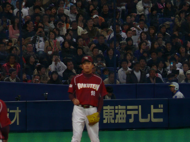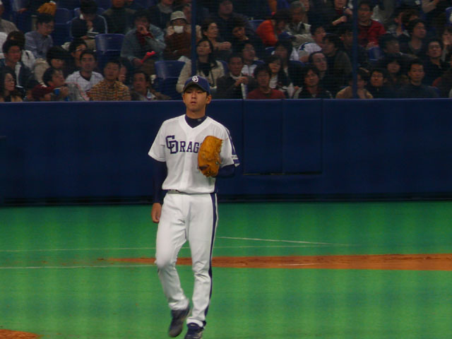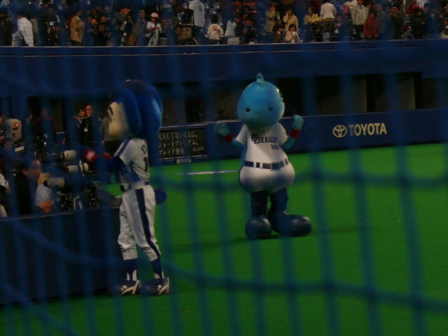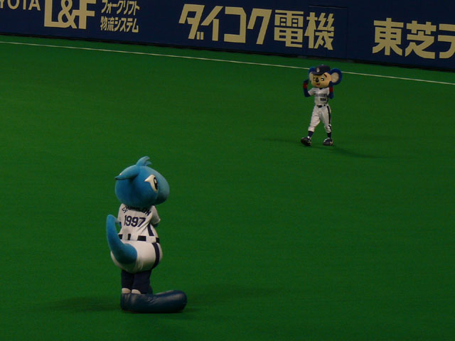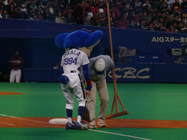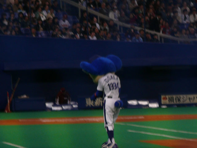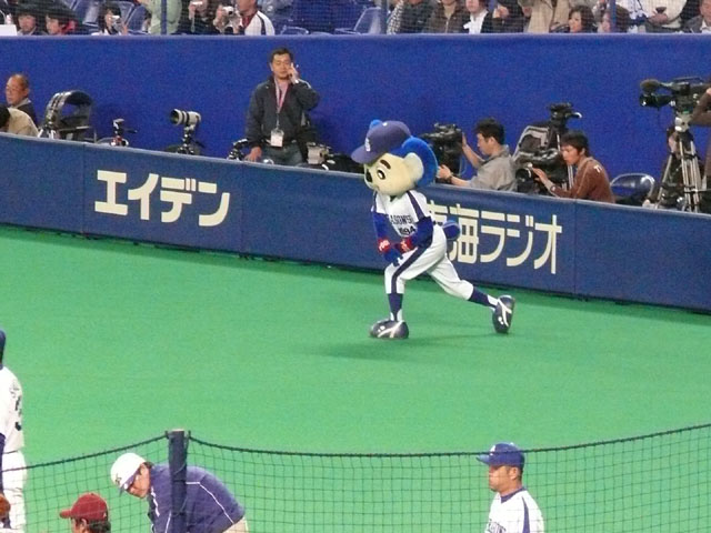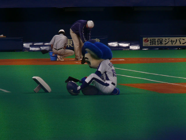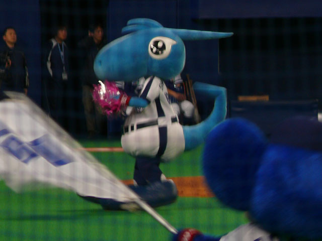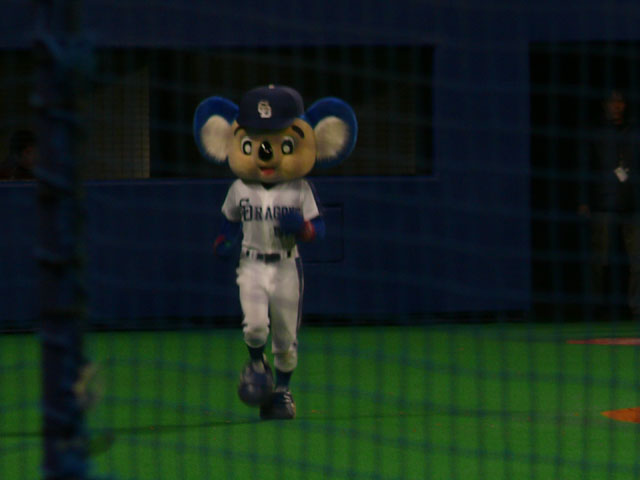席に着いたらSANAさんにいきなり声をかけられました。かなり近くの席だったみたい。何故、申し合わせていないのにいつも会うことができるのでしょうか? 試合前に出てきたドアラ。準備運動。・・あれ?イベントのときよりも普通じゃない?? シャオロンもサインに大忙し。 親子連れで、お父さんがお子さんに「ドアラがいるよ」と言ったけど、お子さんは「シャオロンがいい!」といっていました。ほのぼの。 ドアラ、落ち込んでます・・じゃなくて、何か拾っていました。 ハイ、キマシタ。田中くん。 そしてスタメン発表。 ライトスタンドの応援団の音楽にあわせてシャオロンとドアラが踊ります。 とんぼがけ職人さんから箒を借りて、ドアラもお掃除お手伝い。ところが。 駅のホームで傘をゴルフクラブに見立てて練習するオッサンか?(今時そういう人もみなくなりましたが) ベースボールメイツにも「変なの」と見られてるのでしょうか。 今度は一塁ベースをお掃除し始めました・・・が。 座り込んで、自分の靴裏の掃除を始めました。 しまいにゃ、ゴルゴ(SANAさんではない)になっていました。 「もういいから、箒返してよ」 とぼとぼ・・・。 ・・・いかんいかん、またドアラばかりになってしまった。 シャオロン、おなかが三段に・・・。 実際見るのは初めてです田中投手。 コースケさんが二塁打を打ち、ウッズさんがタイムリーにて先取点。 満員のためパノラマ席も開放。そうすると売り子さんたちも出番です。 キャッチボールの最中の西川選手。 あ。 「ORZ」はありませんか?(ぉぃ 中村ノリさんにHRを打たれ、崩れだした田中投手。ピンチです。 荒木さん、この打席はフォアでしたが、調子よろしくないね・・・。 ドラのピッチャーは朝倉-小林-と来て、次に中田投手。 イニングの間はドアラも慌ててやってきます。オープン戦はドラ選手のHRを祝いには来ないのね、ドアラ。 今日なんとなくドラショップで森野さんユニを探しましたが、発売されてないみたいですね。売っていたら、買っていたかも。なんでなのかはよくわからないけど(え? ラッキー7のとき、旗を振っていたドアラは帰るときにシャオロンを旗でつっついていましたよ。 最後は中里くんでしたね。ちょっとヒヤッとしたところもあったけれど無事抑えることができたのでOK。 試合終了後にドアラとシャオロンに挨拶。ドアラ、応援団のところで踊るかと思ったけれどめずらしく(?)グリーティングやっていました。おかげで私もドアラに話しかけることができたけどね。 ありがとう、ドアラ、シャオロン。 それにしてもドアラの人気は凄い・・・。 というわけで妙に中途半端なレポになってしまった。 とりあえずしばらくナゴドでの試合はないし、さすがに刈谷とか小牧とかのデーゲームに行くことはできないので、しばらく撮り溜めした写真を載せることができるかな・・・。 刈谷、SB戦だから本当は行きたいけど・・・。(←ムネリン目当て) 明日、最高気温が8度らしいので、刈谷へ行かれるかたはお気をつけて・・・。
