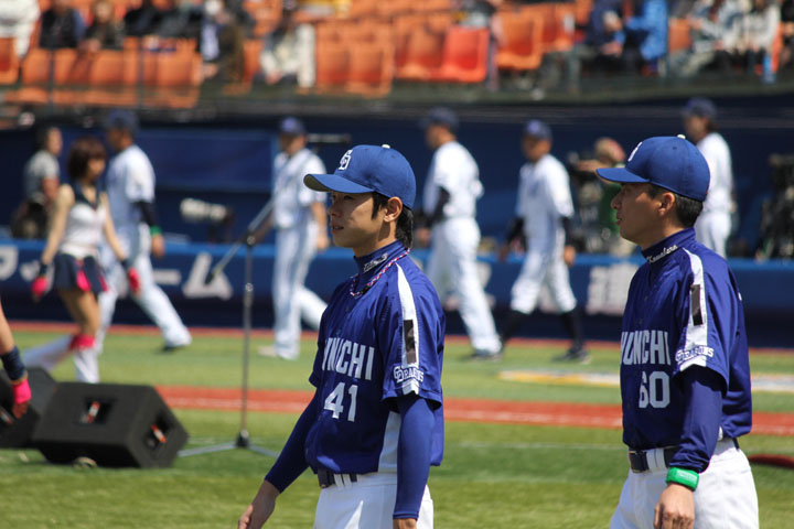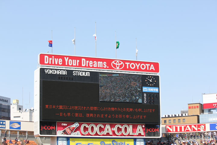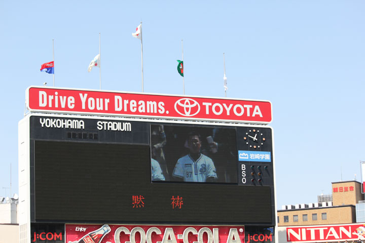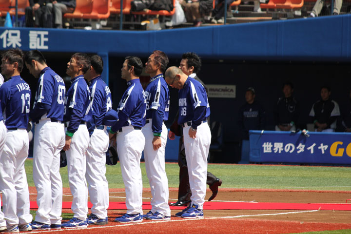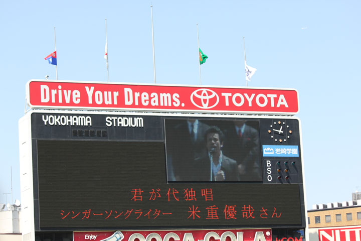 ハマスタへは一泊二日でした。エイプリルフールでにーさま(旦那)には「3日間行ってくる」と言いましたがそれは嘘です。大して変わらないんですがね。 で、開幕戦ではセレモニーがあるのでまずそちらをさらっと。 エキベーさんも喪章つけてます。 4/12 ハマスタ