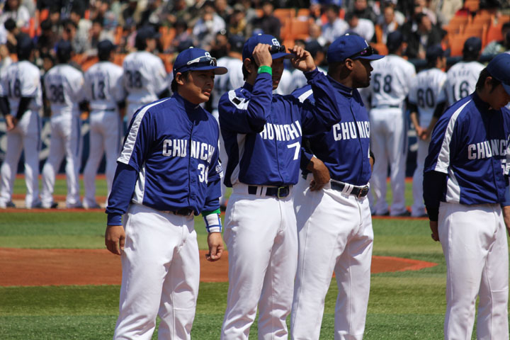 セレモニーで整列します。監督今年もよろしくお願いします。 神。 浅尾くんと河原さん。 グスマンとばっさん。 あ、こういうふうに整列。 ブランコ、佐伯さん、もりのん。 整列しました。 国歌斉唱のため脱帽します。 米重優哉さんが国歌を歌います。国旗もあがります。 一番上まであがっちゃった・・・。 黙祷の最中に半旗に戻ったようです。