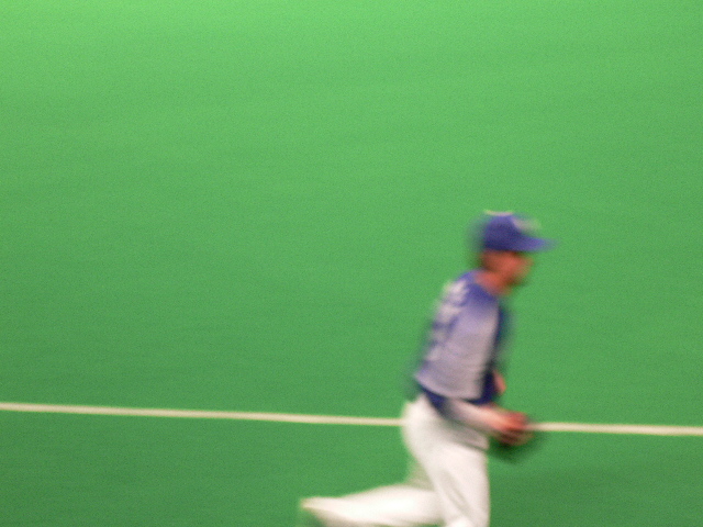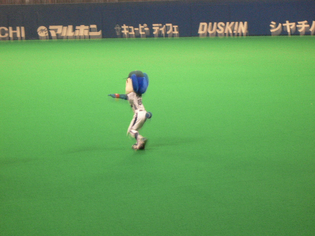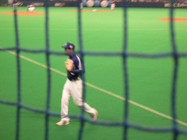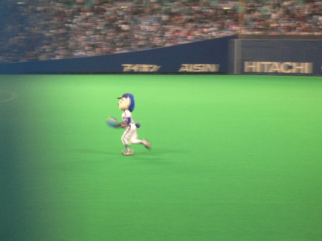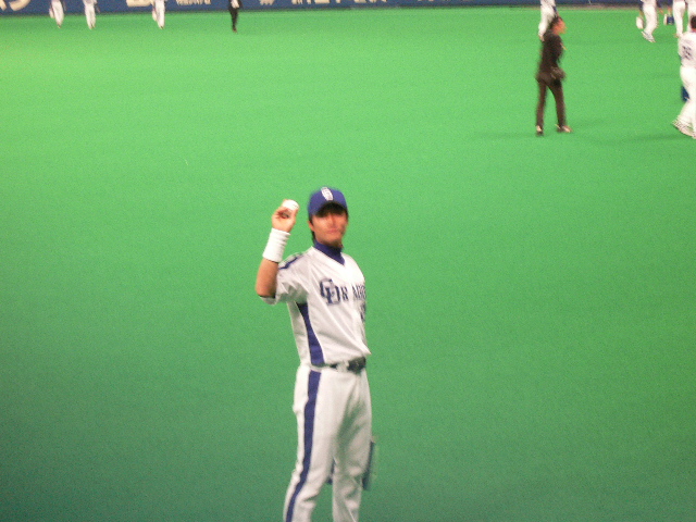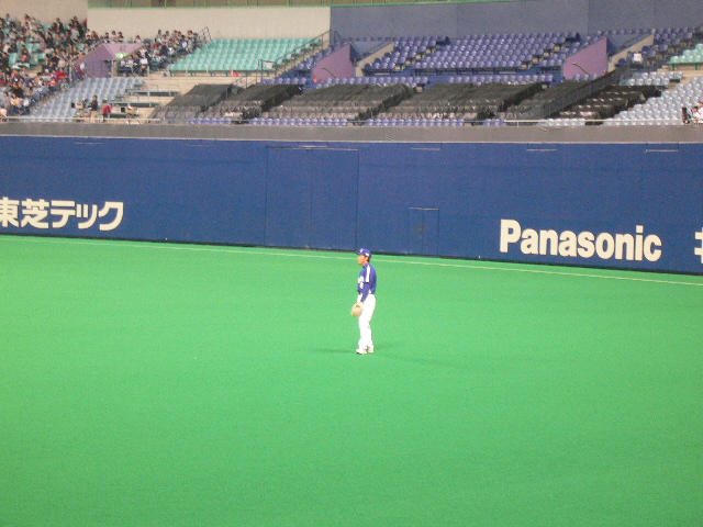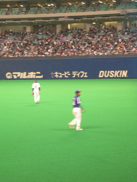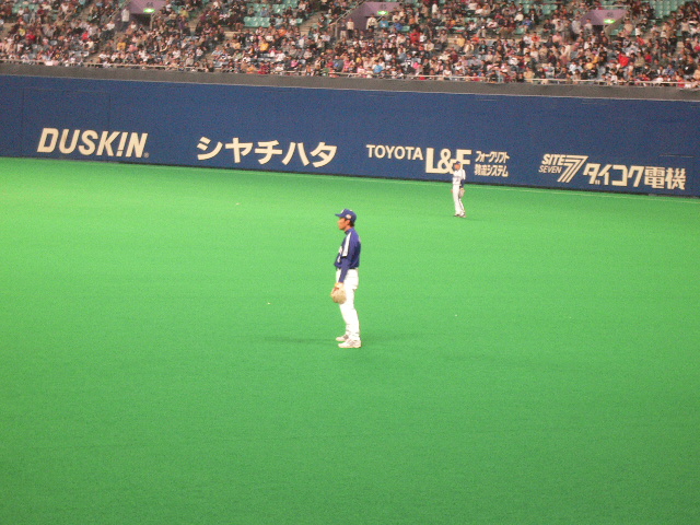 ピンボケだけど、外野守備につくアライバ。今年センター荒木を見たから、それはなんか違和感ないね。