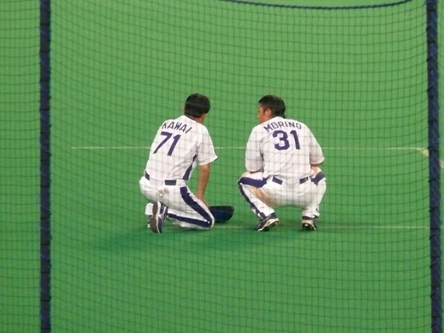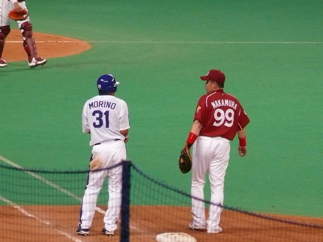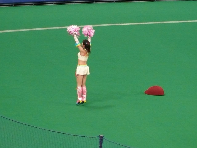 パオロンのおなかがどれだけおおきくなっているかが・・・。 5/27の楽天戦。仕事後に行ったので途中から観戦です。 なつが「どうしよう・・」ってな感じでクラッチのでかい帽子もってます。