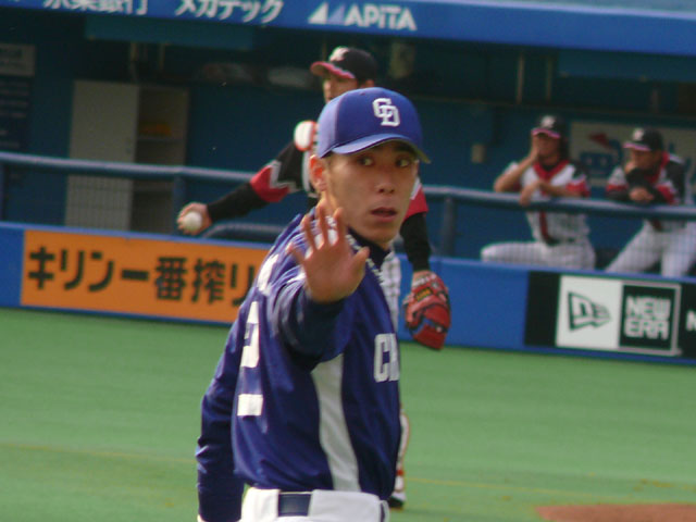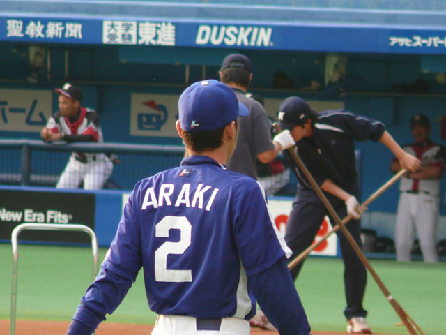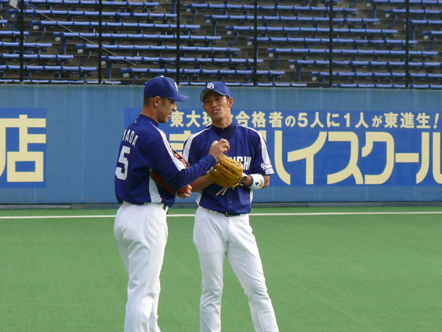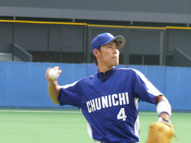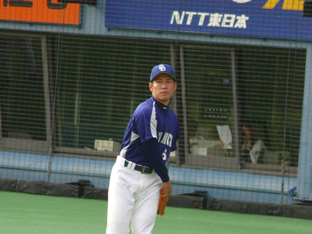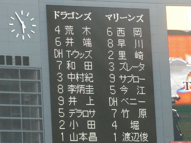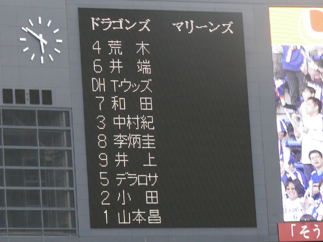 ビジターでの見所はドラゴンズのバッティング練習。藤井選手。 あらきさんのせなか。 キャッチボール始めたいばちん。 ちょいと遠いがいばちん。 ピンボケしてますが、誰かの声援に答えてくれたあらきさん。 悩ましい表情の和田さん。 相変わらず表情がつかめない英智さん。 帽子に4と何か書いてある藤井くん。 キレイに撮れる、一樹さん。 もうちょっといばちん撮影。 2004年の頃アタシは熱狂的井端ファンでした。いや今でも好きよいばちん。 ん? アライバとロッテの今江選手。今江さんステキな笑顔です。 外野方面でなにやらお話中和田さんと藤井くん。 マサさん登場。 これもアライバ。なんか絵になる。 ジャンピングあらきさん。 ちょっとおすわり。 ガサーラがスライド登板すると思っていましたがマサさんでした。私の予想はアテにならない。 ドラスタメン。 円陣。しかし和田さんはよく帽子とるなぁ。 険しい目線のビョンさん。 最近ビョンさんになごみが足りない。 こんなスタメンでした。 次の選手photo更新はあらきさんとスイカですね。
