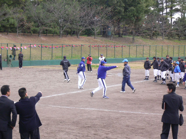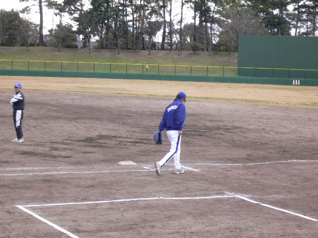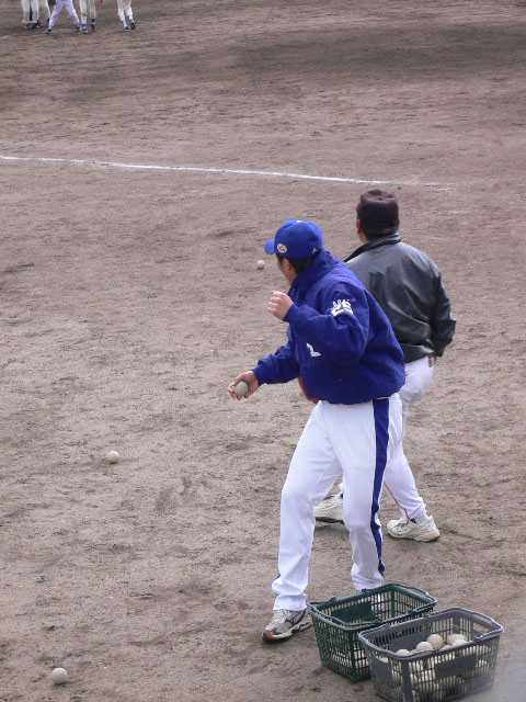 守備練習も兼ねるため?三木コーチが線を引いています。