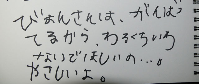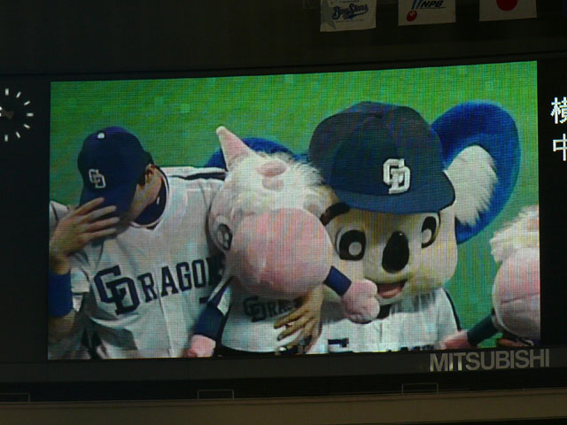 ビョンさんとパオぬいぐるみとドアラ。最近ビョンさんはイニング間とかにドアラにも絡んだりしています。 昨日のグリーティングでパオさんが私に紙とペンを貸してと要求してきて、一生懸命書いていたのがコレ。 既にオレドラさんとこにも載っているけどね。 ・・・なのです。 まぁパオさんに頼まれたとしてもビョンさん個人のファンになることは今の時点ではできませんが、もちろん応援するよ。 ドラゴンズの選手としてドラユニ着ていてバッターボックスに立っているのだから、ビョンさんを応援する。 活躍してくれればもの凄く嬉しいし、タイムリー打ってくれたら万歳三唱をビョンさんのために気持ちを込めてするし、ビョンさんにコールも送る。 だから、ビョンさんも「がんばる」だけじゃなくて、活躍してほしい。 ドラゴンズの勝利に貢献してほしい。 そうなってくれることは本当に願っている。 そしていずれビョンさんのユニ買ってしまうくらい活躍してくれれば本当に嬉しいことさ。 韓国時代の成績は知らないけれど、今年はビョンさんにとって不本意な結果になっていると思う。 とりあえず落ちる球を克服してほしいんだけどなぁ。 課題はまだいろいろあると思うのでなんとかクリアしてほしいと思う。 パオさんがビョンさんの癒しになって、ビョンさんが活躍してくれればそれは本当に嬉しいことだ。 ちなみに私はビョンさんと絡んだことはないしそんな機会もないのでビョンさんが優しいのかどうかはわかりませんが。 昨日のビョンさんの優しさを垣間見た瞬間。 5回表の二死満塁のとき、金城選手が凡退。 見ていなかったけど、金城選手のヘルメットが一二塁間に落ちていた。 ビョンさんが拾って金城選手に渡しに行っていた。 優しさを垣間見た瞬間でした(?
