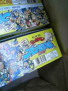 今現在関東地区のみに発売されているビックリマンプロ野球2007を、にーさまがビレバンで発見、3箱購入してくれたのを写メしてくれた。私の手元にはまだない。