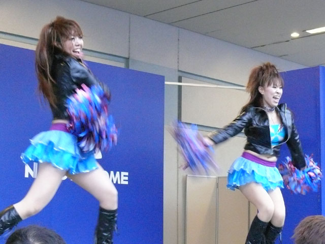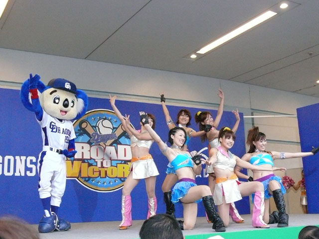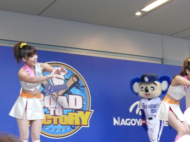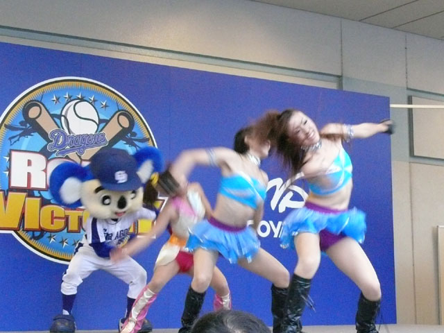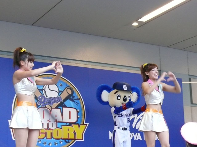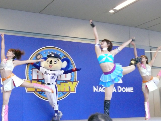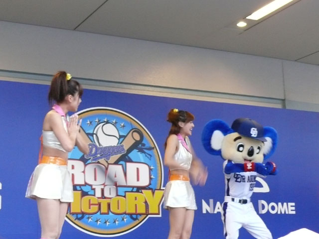 いまきちゃん、ゆうちゃん、なおちゃんが指導してくれてます。 先ほど追い返されたドアラもいつの間にやら。 ドアラ流解釈ハート。間違いではないとは思う。 D-STAGE始まりました。最初のときみたいに黒ジャン着てダンス。 やっぱり、かっこよさに迫力が増します。 そして女子十二楽坊。ドアラ足上がってない。 チアドラのみんながかっこよく踊れているからこそドアラの変さがひき立つ。 この日も、大成功であった。