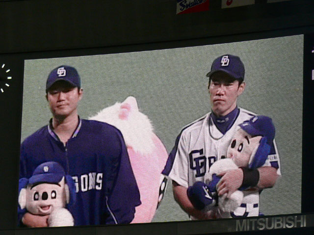 外出してたのでテレビは一切見れずに、携帯のドラゴンズ情報で試合の経過を見てまして。 9回裏だけ車でラジオ聴いてました。 そこでヒーローインタビュー、誰が出てくるのかと思ったら中田くん。 インタビュアー:「8回まで1失点の中田投手です」 インタビュアー:「9回は忘れましょう!」 ↑一緒に聞いていたにーさまがばかうけしとった。 とりあえず某さん、遠征初勝利おめでとうございます。 横浜にドラマスコットとチアドラ遠征。チアドラ、一体誰がメンバーなんだろうかとわくわくしてました。 昨日、平田のなっちゃんとゆりちゃんをテレビで確認! なっちゃん。めちゃカワイイ。 以下マスコットなしです。