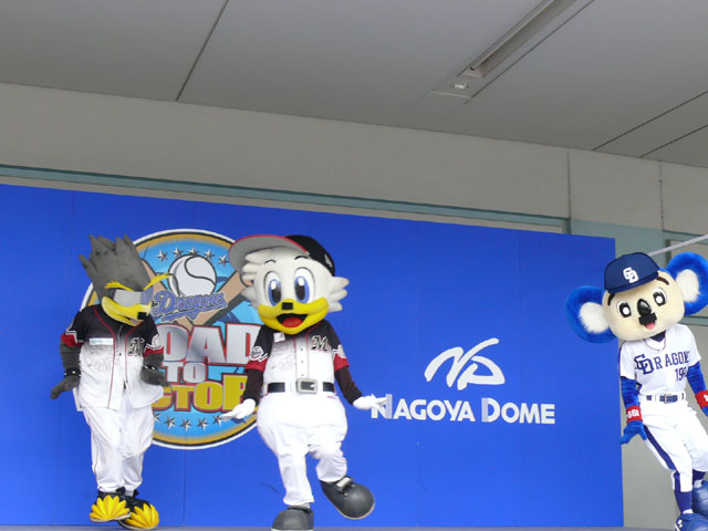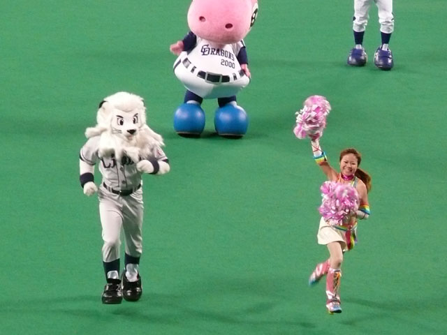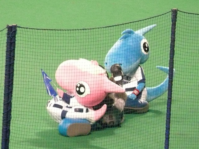 というわけで交流戦で溜まっているものを更新するチャンス。 もちろんマリーンズ戦もなんですが、私はB☆Bが大好きなのでここははずせません。 チームもなんか日ハムって結構好きかもしれません。なんか似てるんで・・ドラに・・・ま、ドラにダルビッシュはいないけど、貧打具合とか・・・ 5/24の岩瀬様表彰式前のB☆Bとシャオロンとドアラと平田りんと川相さんと。 B☆Bとドラマスコットのやりとりは、パオロンコロコロが有名ですが、地味に何気に毎年B☆Bはシャオロンの足を踏んづけて帰っていくのでした。